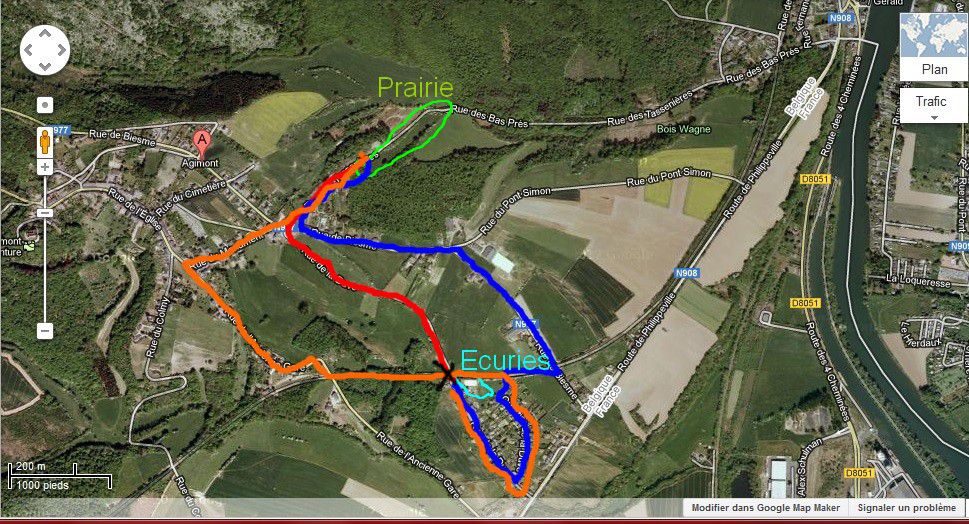 | Dire merci | Le chemin habituel, j'aime bien .. ça prend a peine 10 minutes, ça me permet de voir son humeur, comment il est, j'aime bien ! (bete exemple de son abcès de l'an passé, que j'avais "vu" venir bien avant que d'autres ne voit la moindre gène sans le connaitre a fond) Je ne voudrais pas spécialement l'avoir plus près ![]() Mais là, j'en ai maintenant pour 25-30 min, si pas plus en fait (pas compté exactement ) pour je ne sais combien de temps ! ![]() Alors que j'entre bientot en exam, du coup ça aurait été visite et boulot/balade sans trainer trop, bingo quoi ! ![]() D'autant plus que quand j'aurai 2 chevaux à reprendre, je doute que je prenne le détour bleu .. trop de passage de voiture rapide .. Twist ça va, mais avec un autre un peu "couillon/con" suivant l'un ou l'autre, trop dangereux .. Rien qu'hier j'ai croisé 6 voitures avec remorques qui allaient bien plus vite qu'à 50 !! En plus du coup je le selle là bas .. mais quand il sera mouillé, boueux et autre , brrrr maniaque comme je suis ça va pas le faire !! Le temps d'AU MOINS commencer les travaux, ils auraient pu laisser un espace entre les blocs pour des pietons quoi .. "ok" pour les voitures, mais bon .. faut pas pousser .. ça fait des années que c'est comme ça |