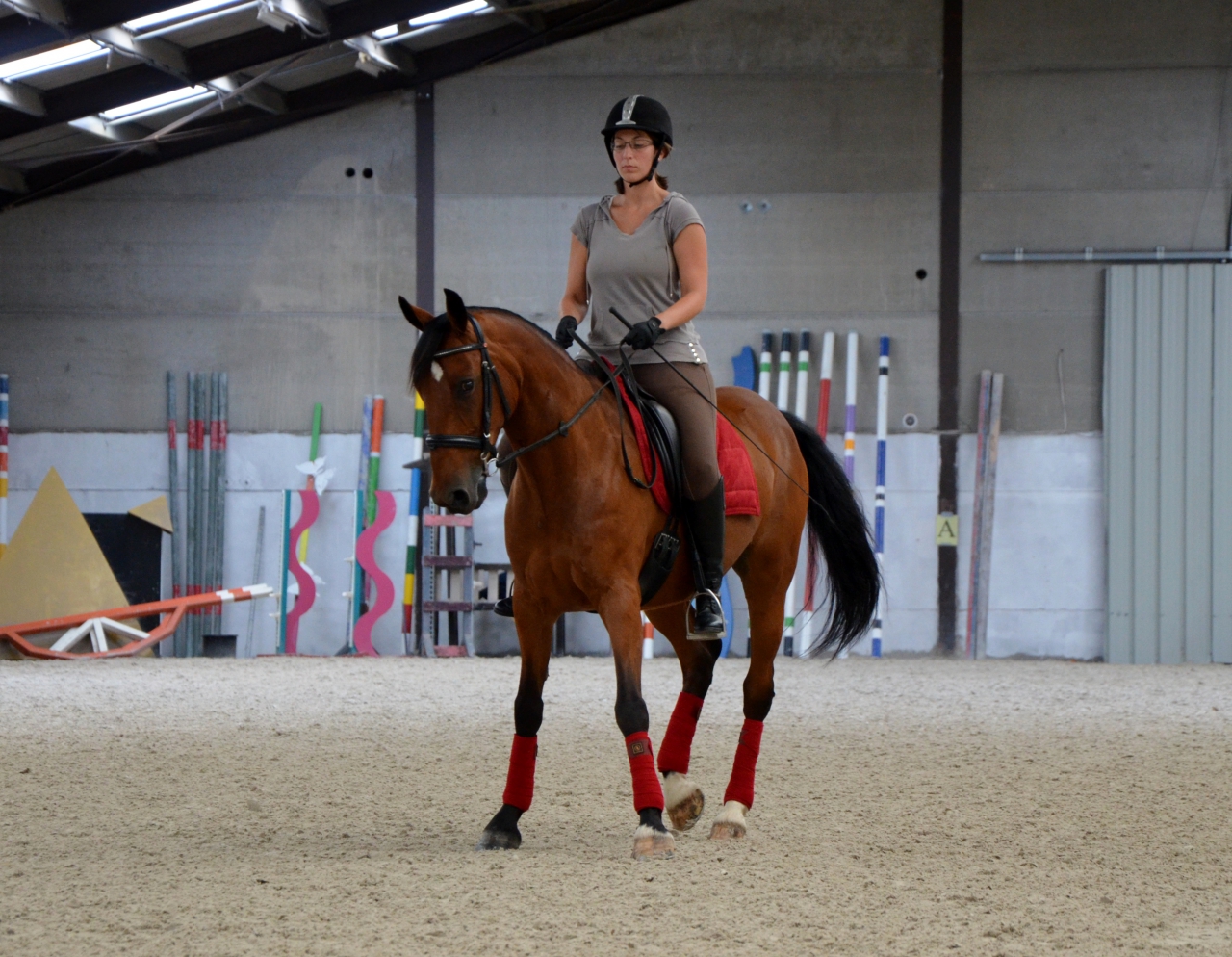 (c'est un démarrage du pas, un cercle, faut avancer les mains sur le coté ouvert du cercle, y a une transition galop de travail-> galop moyen ; galop moyen->galop de travail, puis une transition galop->pas dans une diagonale .. et là Mr a tenté une sortie, du coup j'ai mals pris mon coin, l'ai "perdu" et du coup les transitions galop pas qui passaient pas 'trop' mal hier, bah ça a rien donné
