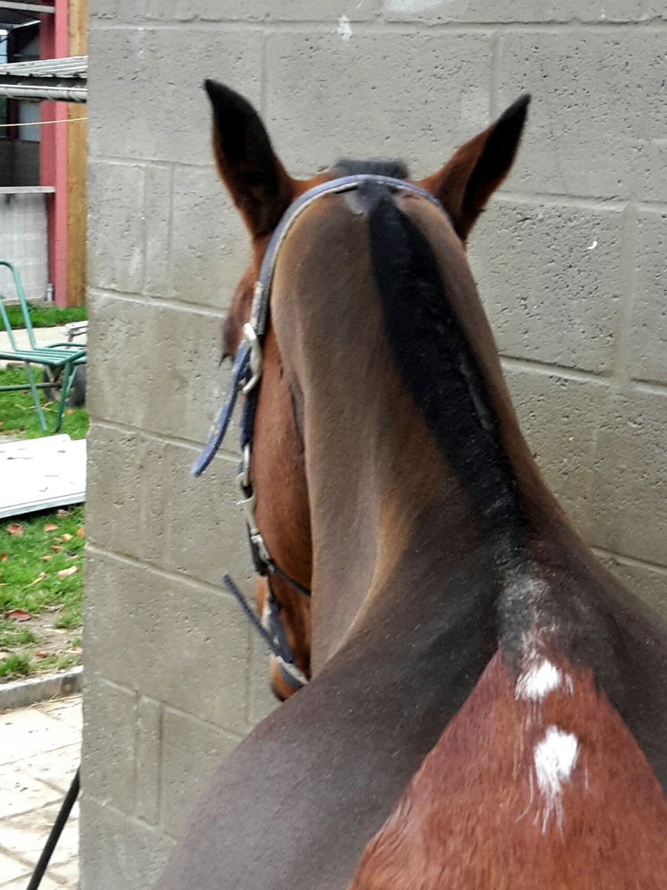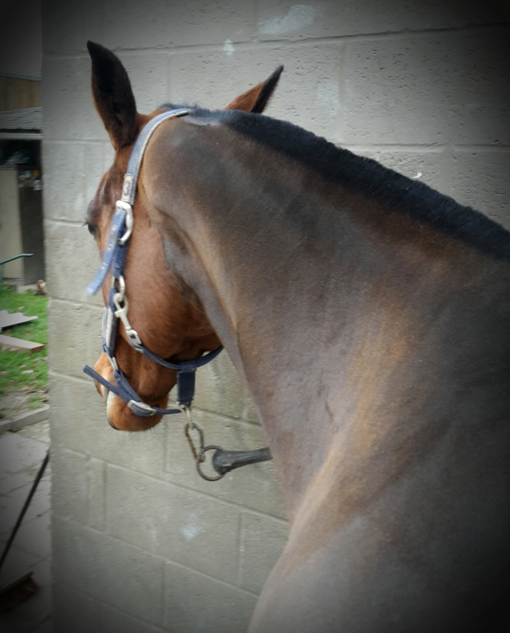 | Dire merci | Oui ça c'est nouveau de cette année .. Les jambes aussi en fait ! Encore l'an passé je tranquilisait pour tête et jambes .. et encore, même tranquilisé j'arrivais pas à une tête comme ça ! Ici je me fâche un peu pour les pieds postérieurs .. il se fout de ma gueule en gros si je vais la en descendant il fera le gros stressé qui bouscule, MAIS si j'y vais après la tête qui fait plus peur, là, on moufle plus quoi .. Ça reste un grand neuneu! Un neuneu qui a encore fort bien bossé ensuite |