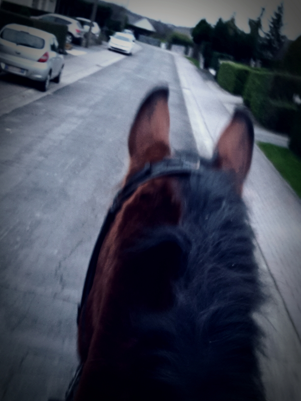 | Dire merci | Sinon, j'ai reposé mes fesse sur le gros dinosaure Vancouver , quel bonheur "simple" balade pour le ramener en prairie à 45 min mais purée quel changement ! D'habitude, ce cheval est con en balade, peur de tout, recule s'il se retrouve une oreille devant l'autre .. jamais il irait devant, mon prof à déjà failli voler qlq fois ...... moi je l'ai jamais pris en balade, il en faisait plus du coup, on faisait les voyages à pied du coup .. Et la, hormis pour sortir de la cours du manège ou y avait le van ouvert au bord, il est passé devant loin devant l'autre toute la balade et n'a fait qu'un sursaut ou Twist m'avait fait pareil, bluffant pour ce couillon ronfleur ! moi qui aurait voulu mon gilet de cross par sécurité .. Hyper à mon écoute, c'était flagrant ! On a même fait un long trot en tête tjs, à moitié dans le noir, c'est doublement un exploit , mon prof était étonné. .. et quel trot de rêve .. ça m'avait manqué On verra s'il rentre de l'hiver ou pas mais il est bien ou il est en tout cas |