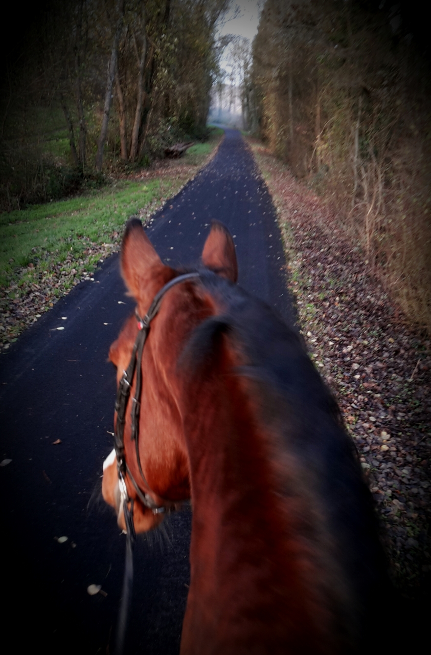) en balade, il daignait pas passer devant, mais j'ai fini par gagner, et ça aussi ça a étonné mon prof, qd il commence comme il a fait a se coller derrière, il cède JAMAIS ! au final on a trotté devant, adorable ..