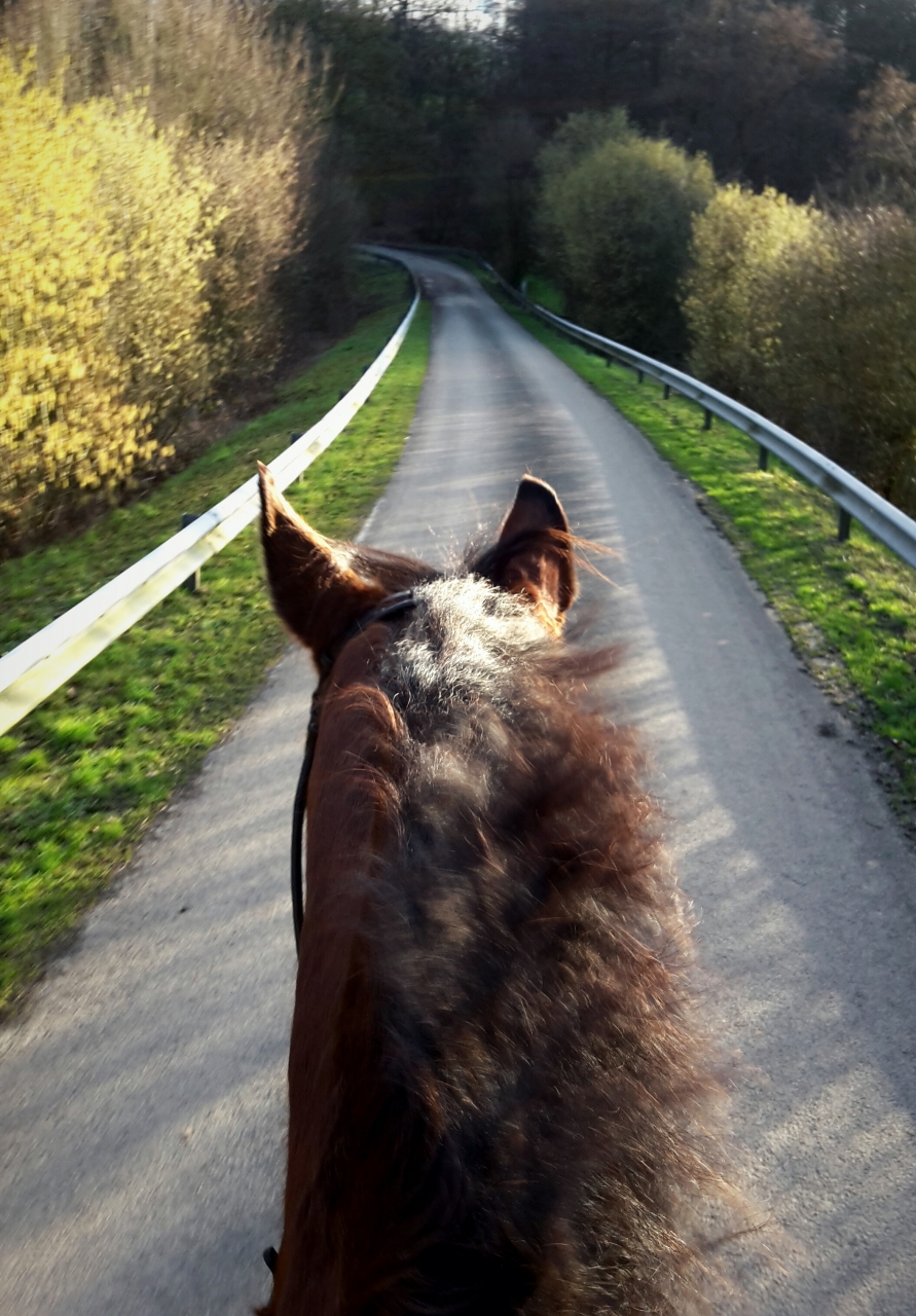 | Dire merci | Et bien et bien ! Twist à super bien travaillé ajrd ! vraiment top top .. ça fait plaisir ..Et super serein et concentré avec ça malgré le vent et le rangement du bois à côté de la piste .. Même la cadence du galop était super même si je le laissais faire ce qu'il voulait de son nez je voulais qu'il se cadence sans s'appuyer .. vraiment pas mal , même les départs étaient avec un garrot montant c'était sympa .. comme quoi le boulot qui précédait était bon ![]() ensuite, malgré le vent assez fort,j'ai pris le risque d'aller balader avec le grand .. il était monté sur 1000 voltes rien qu'en longe à sauter partout rien qu'avec le vent, j'étais kamikaze pour le coup mais j'étais motivée je me suis équipée de mon gilet et zou ! Il était con con mais sage .. beug aux chevaux de trait, moutons,gros poids lourd rouge flash .. il a tenté 2 demi tours mais j'ai qd même gagné! ! Déjà, à l'endroit où on avait tourné la dernière fois il a tenté de m'emmener et pilais si je forçait de l'autre côté On l'a fait UNE fois quoi !! Il est super trop malin J'ai qd même gagné .. seule et 1er échec à moi même, j'ai nommé :L'ÂNE! !! Grand moment de solitude on trottait tranquille sage, paisible (ou pas ) QUAND SOUDAIN : beug ! Il aperçoit de super loin cadichon la, j'aurais pu danser sur ma tête c'était NIET .. j'ai du descendre, il était tremblant, soufflait super fort tel un dragon (pas ronflé hein, le truc que font les sanguins en liberté en mode ahuri. .) Même en main c'était chaud j'ai bien fais de descendre parce que ça aurait été dangereux ce coup ci .. tte façon il serait jamais passé ..Non vraiment les ânes il aime visiblement paaaaas du tout Suis remontée plus loin et RAS pour la suite malgré son stress du vent .. C'était sympa qd même ! ![]() ![]() Là c'est le drame image sans le son ça rend moins .. fallait le sentir trembler en dessous de moi quoi ![]() |