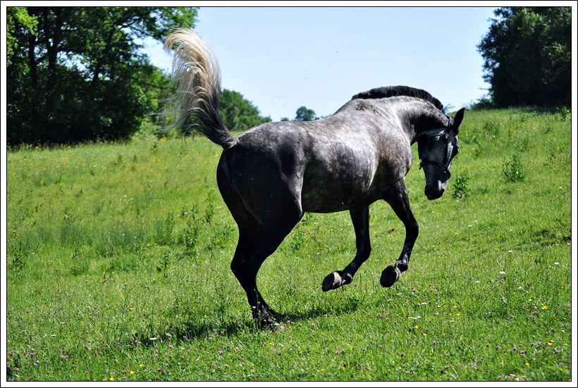 | Dire merci | joli cheval ! il saute sacrément haut le bougre !les pommelures lui vont à ravir, j'adore |