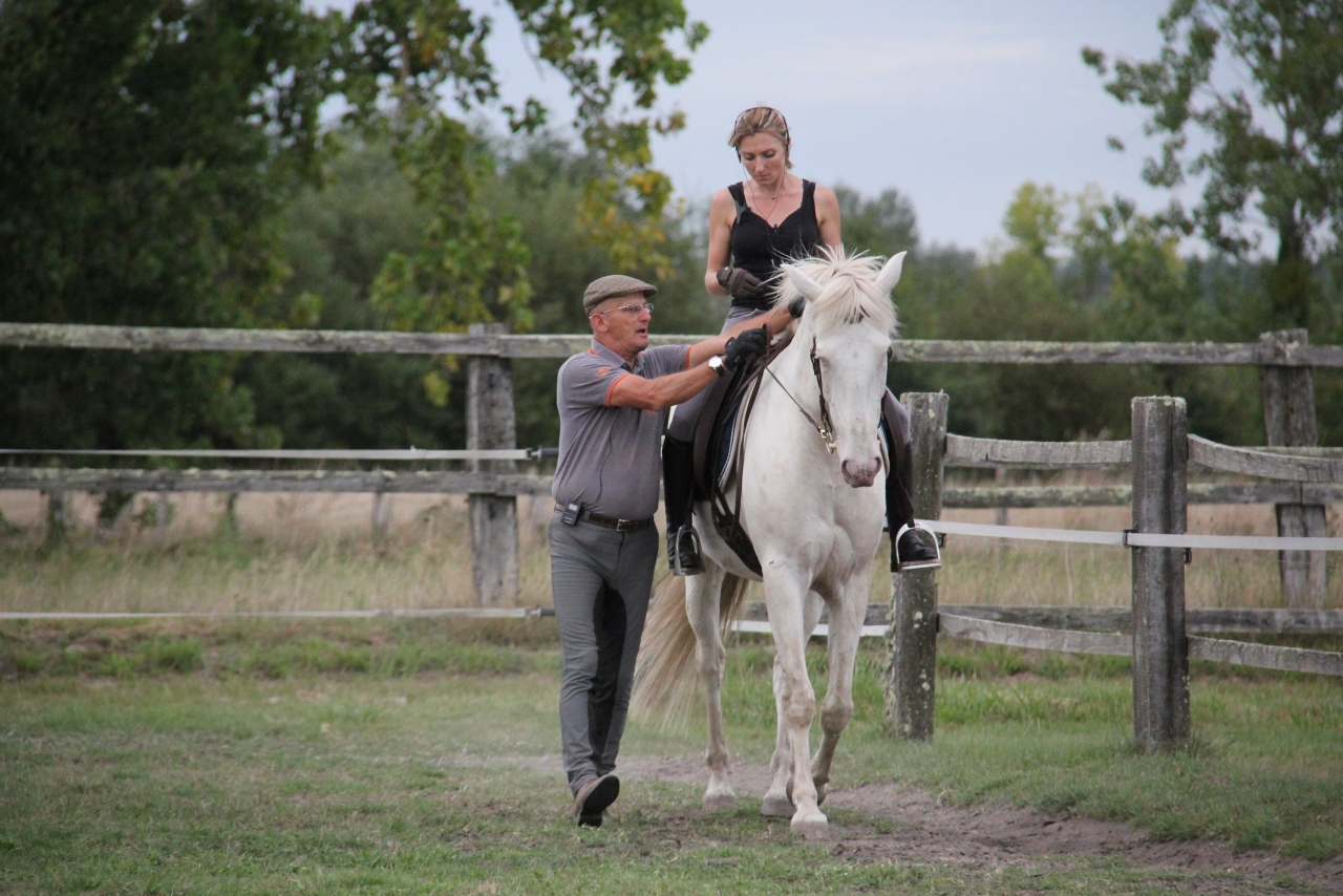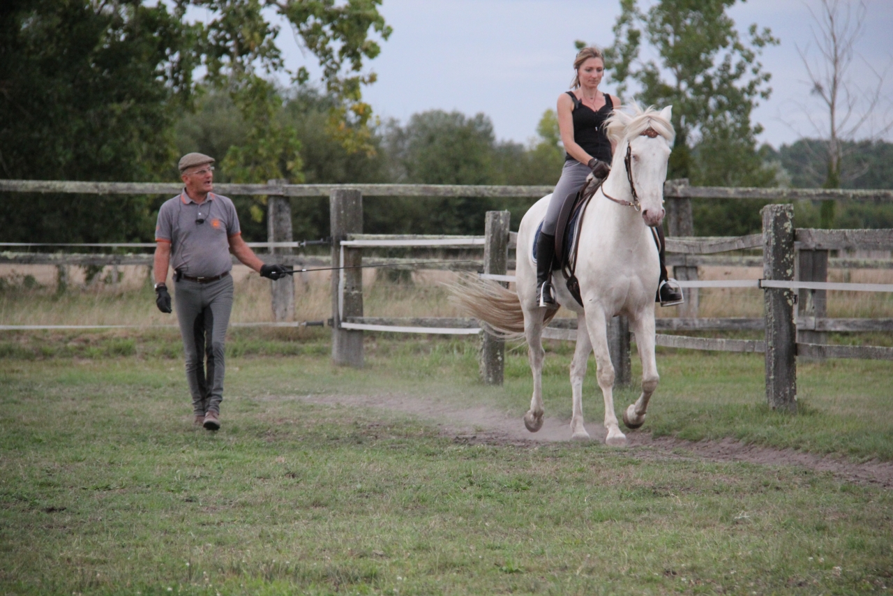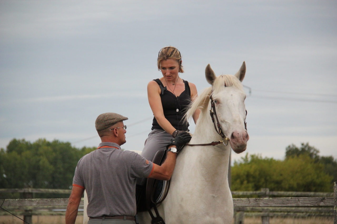 | Dire merci | je dé-sousmarine pour donner mon avis car cela fait 3 ans maintenant que je fais des stage avec Claude au Haras de la Fauconnerie. J'ai un mérens avec vraiment un gros caractère qui le fait savoir dans les règles si on est injuste avec lui. Claude, c'est le seul prof avec qui cela passe. Alors oui, parfois il t'aide à faire quelques foulées de passage ou de piaffer pour te montrer la sensation, pour te montrer l'objectif final et ma foi, c'est très pédagogue car cela donne envie de s'investir à fond pour retrouver ces sensations. Mais ce n'est pas l'essentiel de ses cours. Le reste du temps on travaille juste le couloir des aides, les épaules en dedans, etc. Sur la vidéo, ce n'est pas représentatif de l'attitude générale des chevaux au travail avec Claude mais il faut dire que Claude travaille en mors mais essaye de s'adapter au max au cavalier quand il arrive donc parfois, il se retrouve à travailler en licol un cheval pas prêt. Lla dernière fois, je l'ai vu essayer de se dépatouiller avec une cavalière qui était venue en S-Hack. Il lui a gentillement dit que l'embouchure n'était pas adaptée au travail en finesse (tout en nous répétant 15 fois tout bas pendant la leçon qu'en Hack cela ne le faisait pas). Et oui, cette séance là, il a essayé d'introduire à un cheval qui n'avait jamais vu une carrière une épaule en dedans en Hack et c'était du coup pas terrible. Bref, je dirais que la qualité mais aussi parfois l'inconvénient de Claude c'est qu'il ne sait pas refuser un cavalier et qu'il essaie toujours d'aider le couple malgré des conditions pas toujours adéquat. |