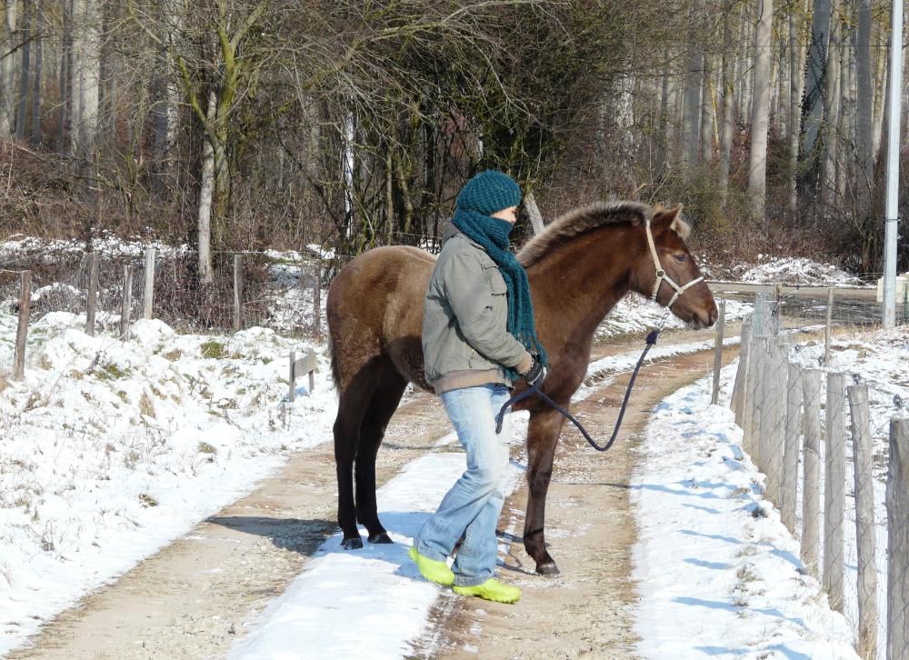 | Dire merci | Allé, des nouvelles, et des photos du beau Baïkal! Monsieur restera donc à la maison, j'ai trop envie de le garder à mes côtés, de le voir évoluer et de continuer à tisser ce lien si précieux. Il est toujours avec maman et une copine a qui il mène la vie dure, mais sera séparé de Jade sous peu, dès que la pousse de l'herbe le permettra, d'ici une 10aine de jours je pense. Une petite photo de cet hiver, balade du mammouth dans la neige (dis, c'est quand qu'on me change ce foutu licol de bébé? Ça tire un peu là... )![]() Et puis photos d'aujourd'hui: |