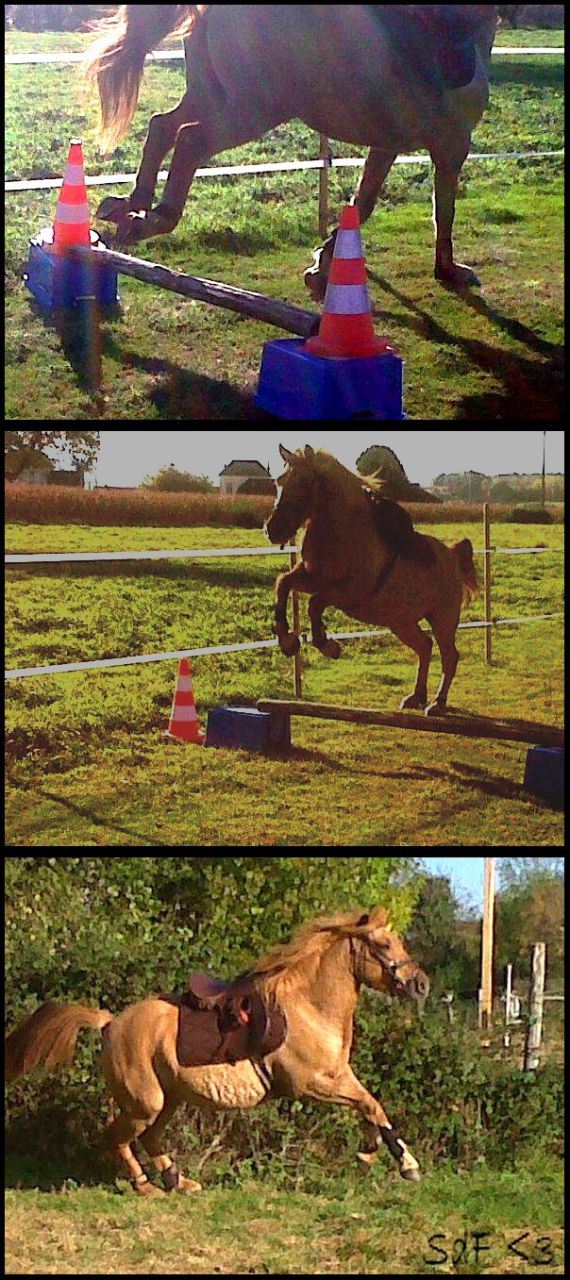 | Dire merci | Dîtes-moi si vous l'aimez hein ![]() Sinon, je saute, je cross, je dresse, je randonne, j'endurance. Avec mors, sans mors, selle classique, selle western, à cru. En jean, en pantalon d'equitation.... Niveau liberté, son record est 1m40 (saut hein), et 1m20 (hauteur Oxer), puis 1m de largeur. Il saute pas mon poney ? Siiiiiiiiiiiii ! |