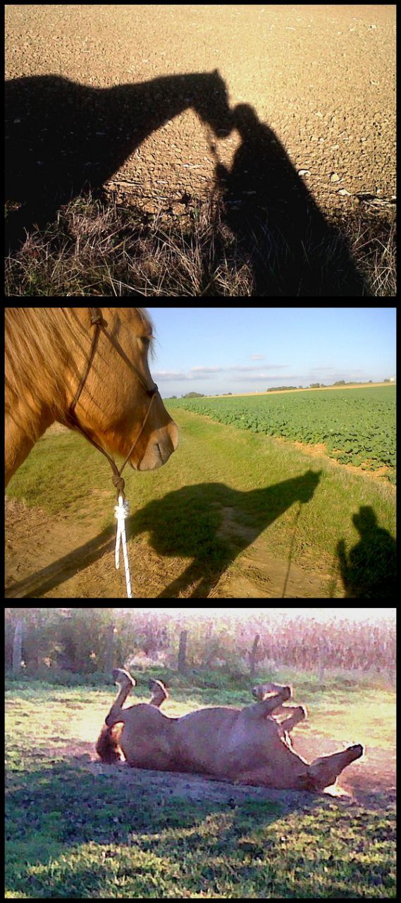 | Dire merci | Tu sous-entend que je suis petite ? ![]() Aujourd'hui, un dresseur est venu sur demande de ma maman, pour m'aider à concrétiser mes objectifs (aller en reprise avec/faire du trec). Il essayait de le faire reculer avec la tête baissée, pour la soumission... Et vas-y que le poney se met debout droit comme un i, et vas-y que j'essaye de virer le dresseur... Sur le cul qu'il était ! "Il te fait ça souvent ? - Non, jamais ! - C'est qu'il t'aime bien alors ! - Et vous, il vous aime pas visiblement...". Eh bien Môsieur So' s'est a peine soumis. En deux heures de boulot... Il a la tête dure ! Donc il part dans un mois, direction le haras du dresseur... Pour qu'il le fasse céder (ce que je n'arrive pas à faire). Comme ça, il arrêtera les tête entre les antérieurs au galop, les sprints non désirés dans les chemins... Etc. On croise les doigts? |
