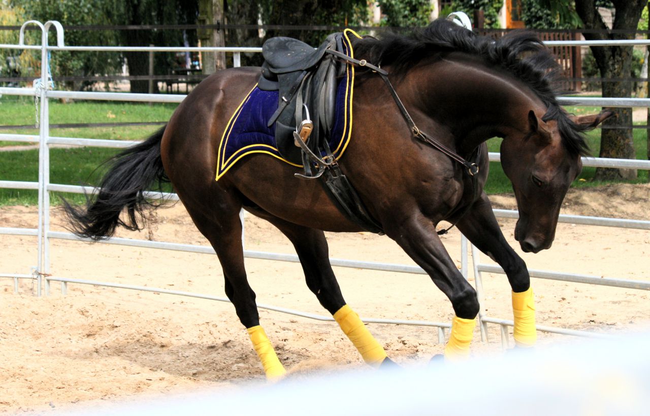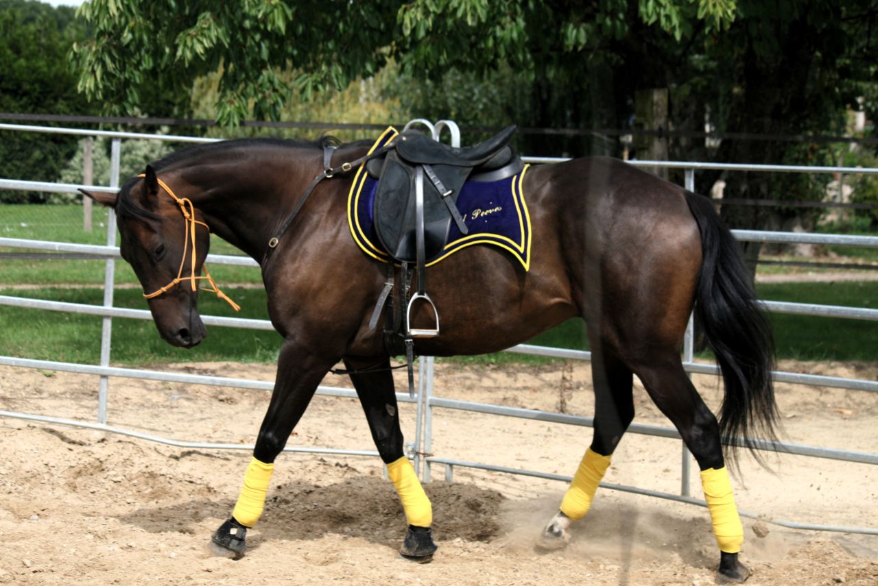 | Dire merci | vi Orge , si jle retrouve sur le net je mets la photo car avt de l'acheter lui, j'ai des protections pr peeves à acheter hihije mets vite fait deux vidéos de la séance où Appoline est venue, qui sont passées: pas gégé, mais bon Au début, tout début, détente au trot, où on voit bien que Peeves est légèrement instable et inconfortable pr moi, il mouline bcp de l'arrière et se retient ds ses mouvements en général. Je le stop net à la fin pr le féliciter car il a organiser sa ligne autour d'une incurvation intérieur, il est venu me donner sa bouche ds une cession de nuque, que je cherchais depuis quelques tps, et il a passé sa hanche au moment de la cession, exactement ce que j'attendais. ça permet tjrs de le délier un max pr pouvoir continuer à trotter ds plus de confort pr nous deux [obj]http://www.dailymotion.com/swf/video/xkoz1h[/obj] et puis une vite fait au galop, le début est chelou il venait de me balancer un coup de cul, auquel j'ai essayé de contrer en relancant direct en avant, d'où le port de tête un peu à la renverse. Je me marre et je souffle comme un cochon agonisant parce que j'arrivais pas à tenir ma jmabe droite et que j'avais bien mal , j'attendais surtout qu'il se cale ds sa nuque, reste décontract ds la machoire et finisse par obtenir un mouvement continu[obj]http://www.dailymotion.com/swf/video/xkoz4g[/obj] |