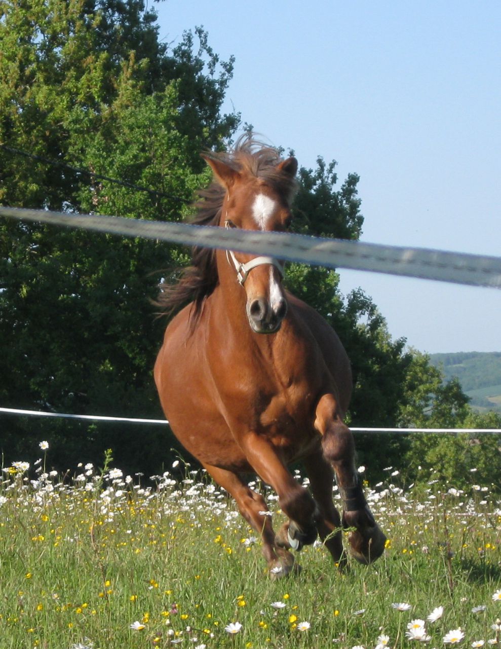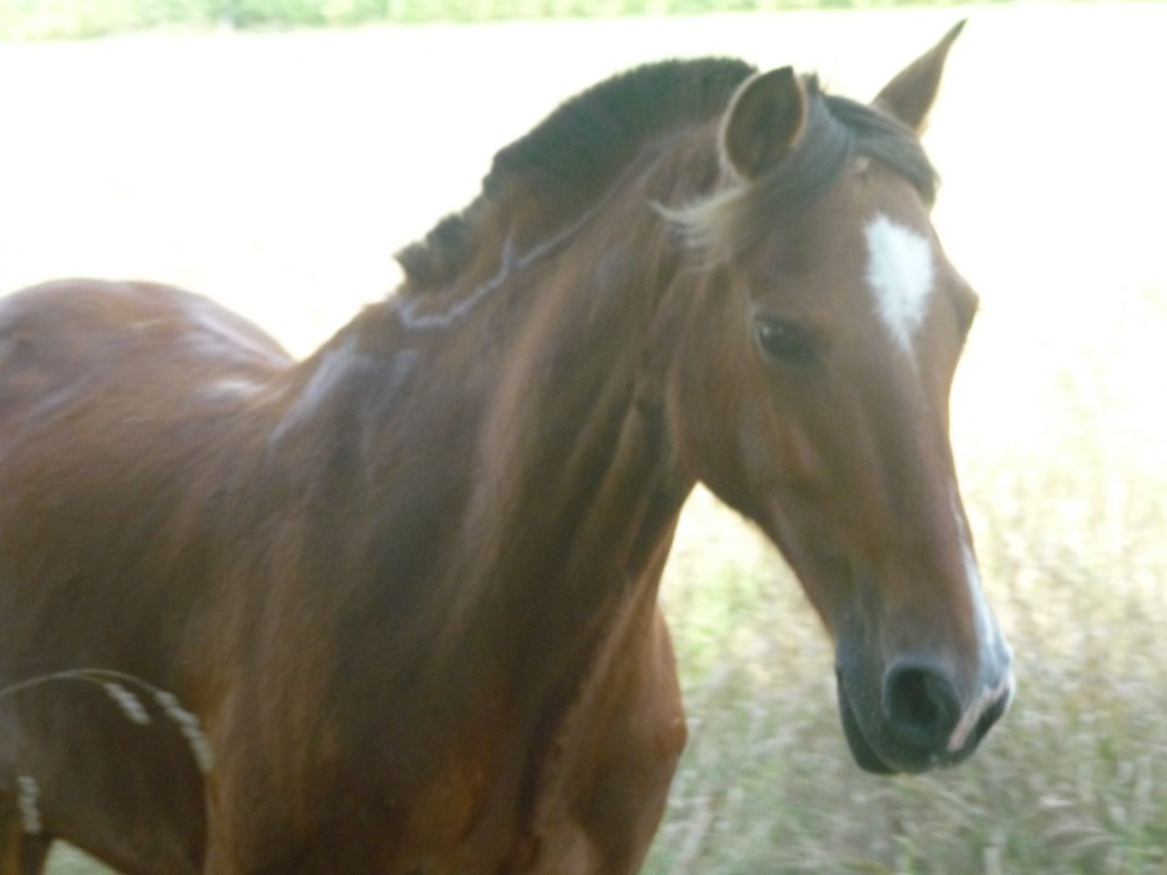 | Dire merci | Puis j'ai tenté une balade au début juste 10 min dans un champ et je me suis fait embarqué. A chaque fois c'était pareil je me faisait embarqué, puis il pilait d'un cop car il avait peur d'une branche, faisait un gros écart à cause d'un oiseau qui s'envole. On ne s'entendait par très bien et plusieurs fois j'ai voulu abandonner. Mais j'ai continué pour lui, pour lui offrir une vie meilleure. En été j'ai eu le droit de le monter dans la carrière d'un ancien centre equestre pas loin de chez moi. On y a sauté et il sautait plutot bien. Mais en octobre quelqu'un a loué les écuries et j'ai du arreter d'y aller. Je ne faisais que de la balade. |