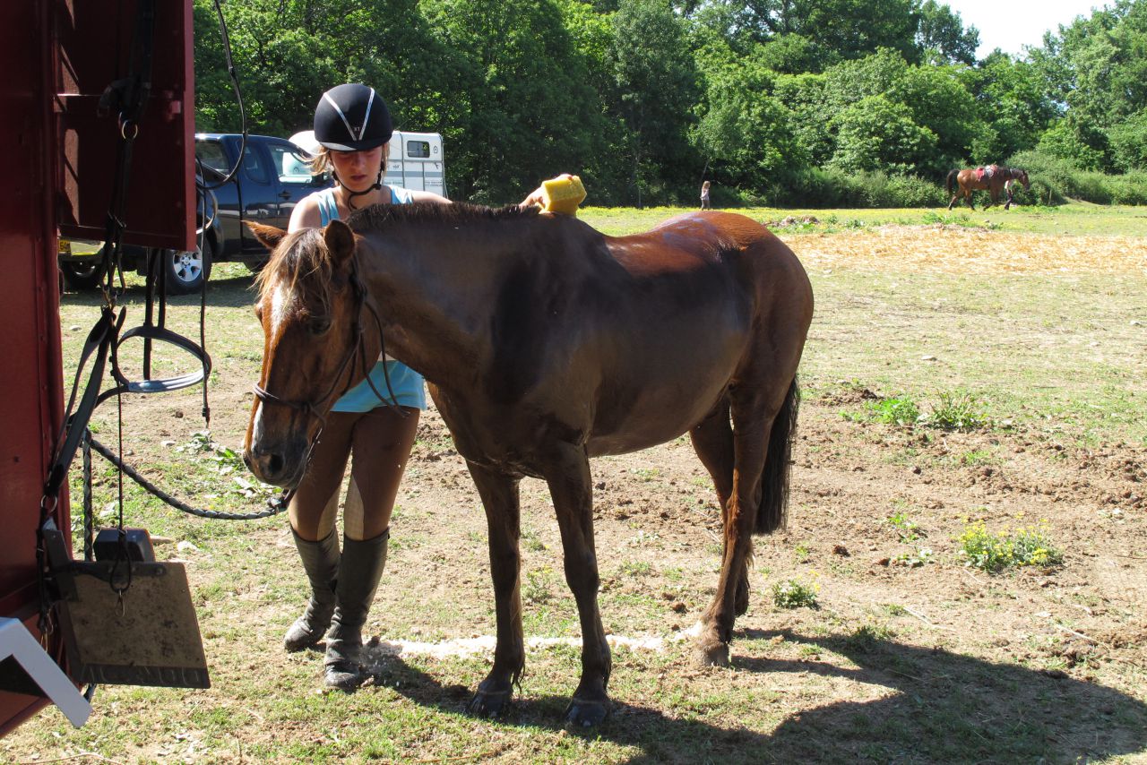). A l'arrivée le poney ne récupère pas, il fait une insolation et on doit le perfuser