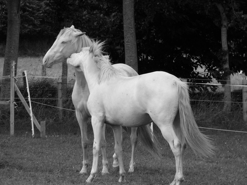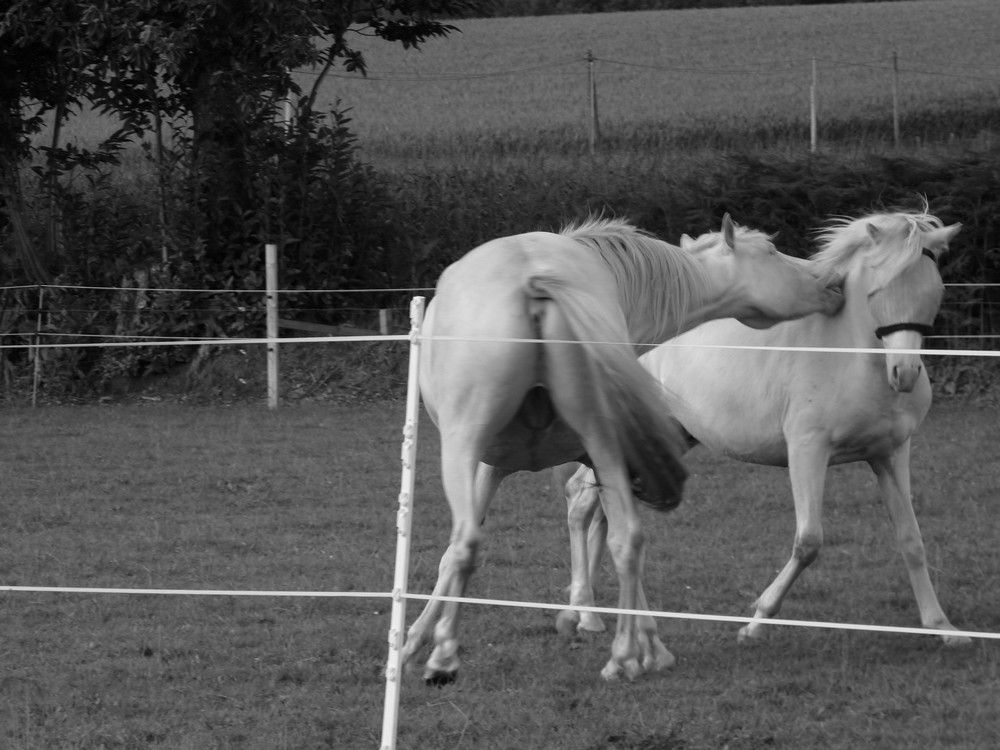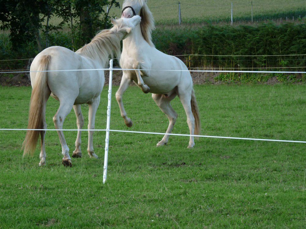 | Dire merci | Je lisais ce petit post, pour tuer le temps... et je découvre deux chevaux magnifiques, avec des postures identiques ! Bravo ! Je ne voudrais pas trop amener ombre au tableau mais soyez prudents. Je connais deux frères, deux grands pies alezans qui sont inséparables. Un en particulier devient complètement fou quand il ne voit pas son frère. Une séparation avait déjà eu lieu durant plusieurs mois, puis d'un jour à l'autre il a peté un cable. Je vous conseille de les séparer régulièrement, pour que ce soit gérable et qu'ils n'en souffrent pas trop. En tout cas, c'est magnifique à voir, cette "fusion" entre deux chevaux ! |
