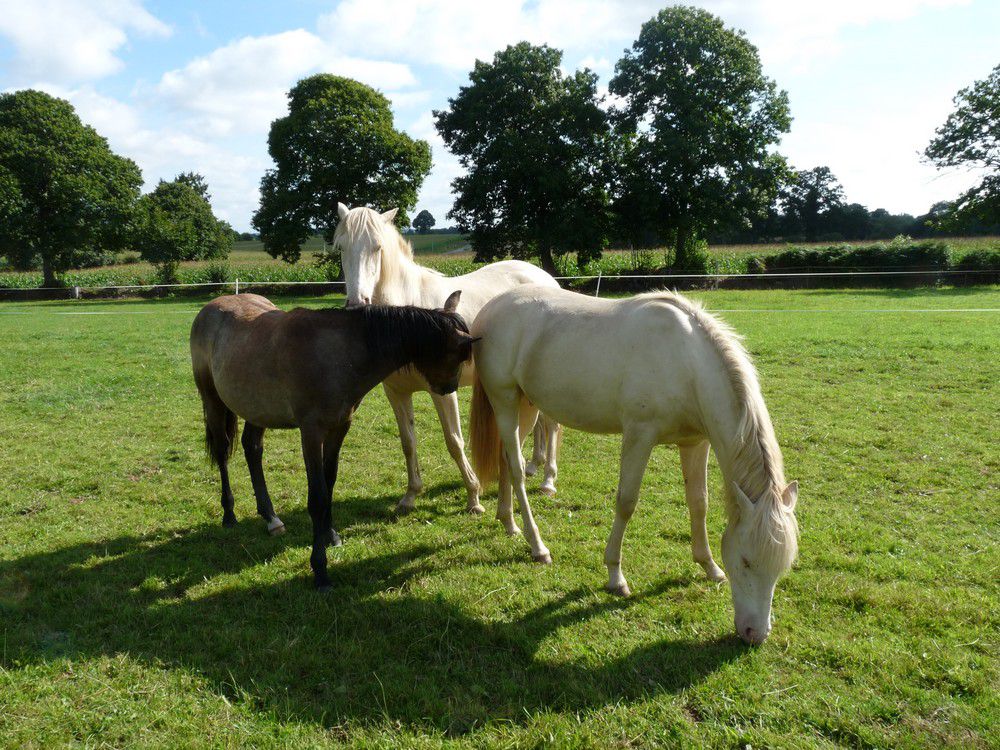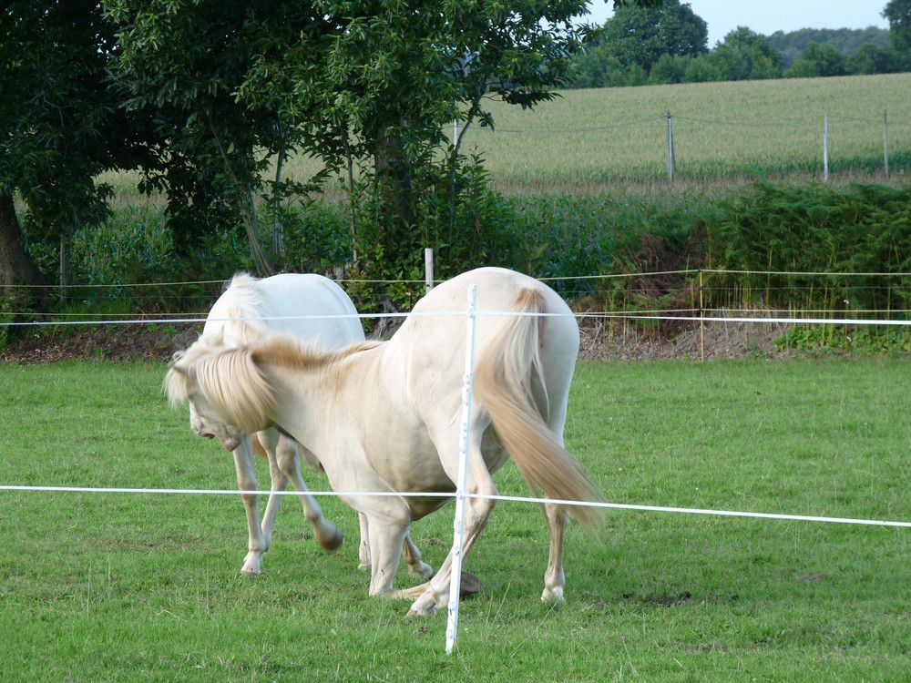 | Dire merci | c'est gentil Julyka ! ![]() je crois que le pire dans tout ça, c'est qu'à aucun moment, dans mes souvenirs, ni Cheveyo ni moi , ne nous sommes demandées s'ils allaient s'entendre !!! ![]() On était aux aguets des réactions d'Umbrio par rapport à l'environnement, mais c'est comme si c'était une évidence, et visiblement, ça l'est pour eux. Alors, résultat de la première nuit : 1- tout le monde est entier. 2- tout le monde est dans le même pré où on les a laissé ( ouf) !!!! 3- Umbrio s'est roulé ! ![]() Mais, petites mésaventures du matin qui donne le ton : Je sors Arriado, comme d'habitude, du pré pour le panser et le nourrir à 3 ou 4 mètres du pré ! et là, Mosieur Umbrio décide de passer sous les fils , pourtant bas, et alors qu'il n'était pas seul dans le pré puisqu'il était avec Aston. Alors là, gros coup de stress, une chance que j'ai un sas parce que là, j'étais pas maligne ! Mais, après m'être calmée à grands coups d'inspiration-expiration, on fait le point et tout rentre dans l'ordre dans le calme. Une chance que mon Dadou m'aide et reste calme, lui il a juste filé à son sceau, du genre " hein, y'a quelque chose d'anormal , scrounch scrounch ???!!!! " Donc, en résumé, tout se passe bien ! ![]() ![]() ![]() ![]() ![]() |