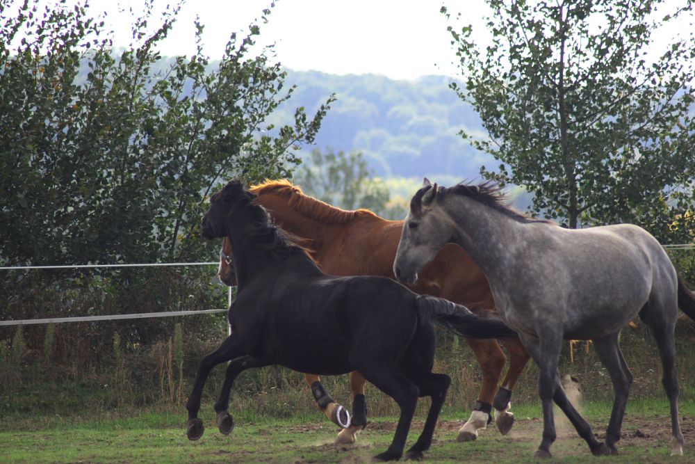 | Dire merci | et puis 10 minutes plus tard, on en est là : Aca cours après les autres et Syre et Very restent peinards total ..... ![]() un peu .... observateurs, c'est assez rigolo à voir ![]() ils la suivent vraiment de près .... ![]() et hop, voilà la folle ; ![]() et pour finir ..... ![]() Et après appareil total mort j'ai eu quelques photos pas top. Ils sont allé bouffer près de la lice qui limite avec la piste de galop, Aca faisait des aller retours, le papi à dit que c'est bien elle fait son entrainement seule et Syre et Very ont brouté..... (UNE SEULE FOIS il a fait un grand galop et je l'ai pas vu ) Puis les cavaliers reviennent, moi je suis au tel avec une copine, et d'un coup ça refait PAF .... ben c'est Aca qui a foncé dans le fil .... et défoncé le fil pour rentrer avec les autres ![]() un peu con les chevaux des fois. Donc Very est rentré seul(e) ? (je sais pas si c'est une fille ou quoi ) et Moi j'étais suspendue à mon cheval sans ma longe en tenant le licol en espérant qu'il ne flippe pas que les autres ne soient plus en vue... j'ai failli voler à un moment mais il est encore une fois resté sage quand j'ai dit "NON" ... POuaaaaaaaah voilà trop contente la bonne journée |