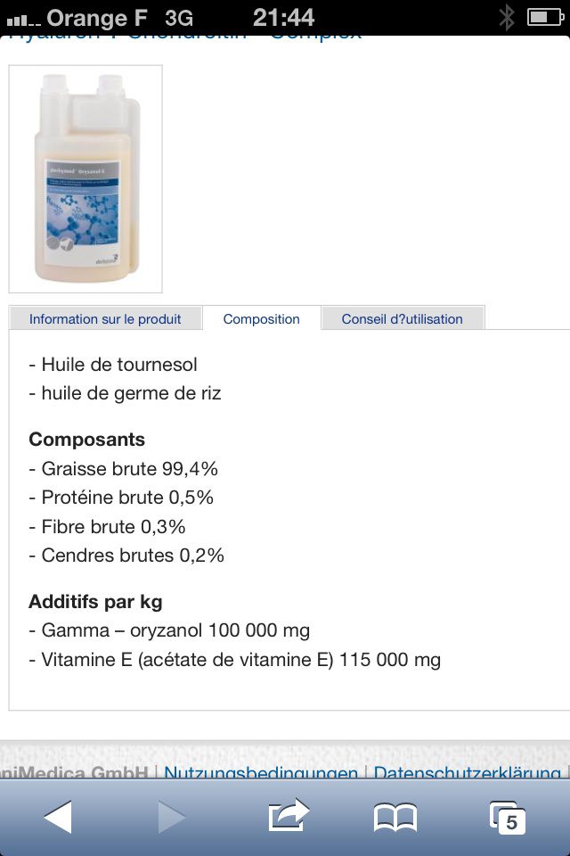 | Dire merci | À sarre union j'avais pas mal monté... En arrivant caro - copine killer - m'avait dit " viens je te paies un kir pour te détendre ( elle me connait bien ...) Oui il faut de la vitE pour fixer la biotine et a priori le zinc et cuivre sont aussi les éléments utiles.... La vitE présente dans l'huile de pépin de raisin mais dosage ??? Sin je prends selen et vitE chez makana, avec la levure de bière. Et hop dans la ration. Après l'huile de lin rancit oui... Au bourde quelques semaines / mois. 1l se tue en 10 -15 j... Sinon y a du lin en grains aussi !!! Ah la bouffe quel vaste sujet. Ce matin gérant au bloc ...( op artérite....il va se faire déboucher la fémorale ) donc j'ai rentrè la compagnie, foin, grains, coup de balais. J'adore faire ça !!! J'adore être seule quand ils machonent leurs grains, le piou piou des zozios. Je suis .... Détendue |