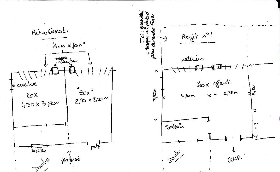 | Dire merci | après moultes reflexions..... alors le box géant j'en ai parlé avec la nana de mon mono qui me disait que ça peut être une bonne idée déjà qu'il est grand, question confort et mouvement si je n'ai que des paddock ça peut etre pas mal ... après pour le côté entretien elle me dit aussi que ce sera plus simple et moins crade si je passe 2 3 fois par jour enlever ce qu'il faut... les copeaux souillés irait directement au jardin de mon chéri qui veut planter 150 trucs. la grange étant 5 fois plus grande que la maison, il y aura de la place pour tout ranger du côté cheval (derrière accolé au box les ouvertures .... pour fourrages etc) est prévu la douche évidemment, (mon chéri s'en occupe) et pour le box, il m'a dit hier que je serai en charge de la démolition - reconstruction et qu'il m'aidera, j'ai envie de faire la maison de mon grand toute seule (sauf que pour le moment les box sont séparés par des trucs en fers, pour les faire sauter ce sera pas facile je pense (mon chéri dit que si ... alors je vais essayer de le croire.ce qu'il y a de bien c'est qu'à a l'ancienne l'espace est en pente, avec des petites "rigoles" (terme alsacien il me semble, petit "fossé" drainant de quelques cm de largeur et profondeur ) qui drainent les urines vers ??? je ne sais où il faut qu on regarde ... alors le dessin (toujours aussi douée hein...) ![]() |