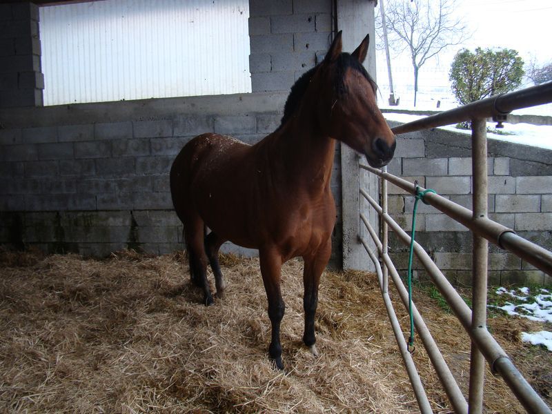 | Dire merci | Je suis déçue!! Je voulais faire des photos des loulous dans la neige, mais en début d'aprem quand je suis revenue avec l'appareil photo, surprise!!! Ils ont pété les fils pour retrouver Dako et Cowboy....!! Quenya serait-elle en chaleur, et avait envie de rejoindre la petit entier???!!! Bref du coup retour au box, tant pi pour eux et tant pi pour les photos...! Donc les photos du jour se limiteront à des photos au box... Moins passionnant que des photos au pré dans la neige, mais au moins ça illustrera la question sur le box! Voici donc les 3 collocs qui viennent de se rouler dans la paille! ![]() Des chevaux qui regardent la neige tombée, en se disant que si ils étaient restés sage dans leur parc, ils pourraient être dehors...! ![]() Dédé crado! ![]() Les 3 à table! J'adore la différence de taille! Elle me fait délirer cette photo!! Devinette: lequel des 3 est un poulain qui n'a pas fini de grandir?!!!! ![]() Et les voisines de box, de gauche à droite: Anka, Coquine, Texas qui vient d'être sevré, et Angelova. Et les taureaux dans le box du fond ![]() Et juste une photo en plus pour vous montrer Angelova que je n'avais encore pas mise en photo. La jument bai c'est donc la PS qui a été sauvé de la boucherie cet été. ![]() |
