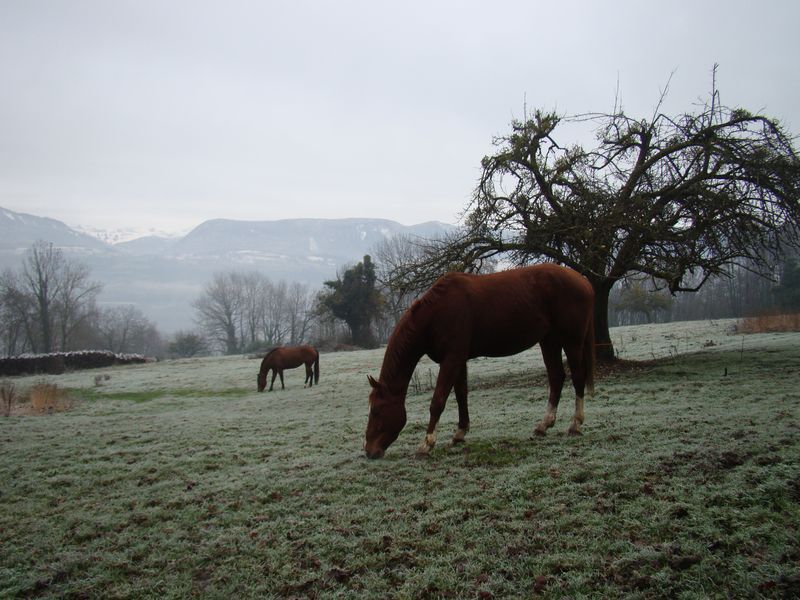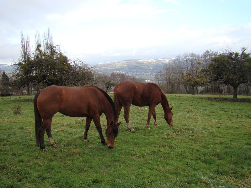 | Dire merci | Ils vivaient au pré avec les copains jusqu'à ce qu'à cet automne, mais depuis quelques temps, ils ont rejoint leur quartier d'hiver. Ils passent la nuit dans un graaaand box de 5m x 6 qu'ils partagent avec leur pote shetland. Voir un cheval d'1m75 se rouler dans son box ça fait plaisir à voir!! Et la journée ils sont au pré ou au paddock quand le sol est vraiment trempé. |