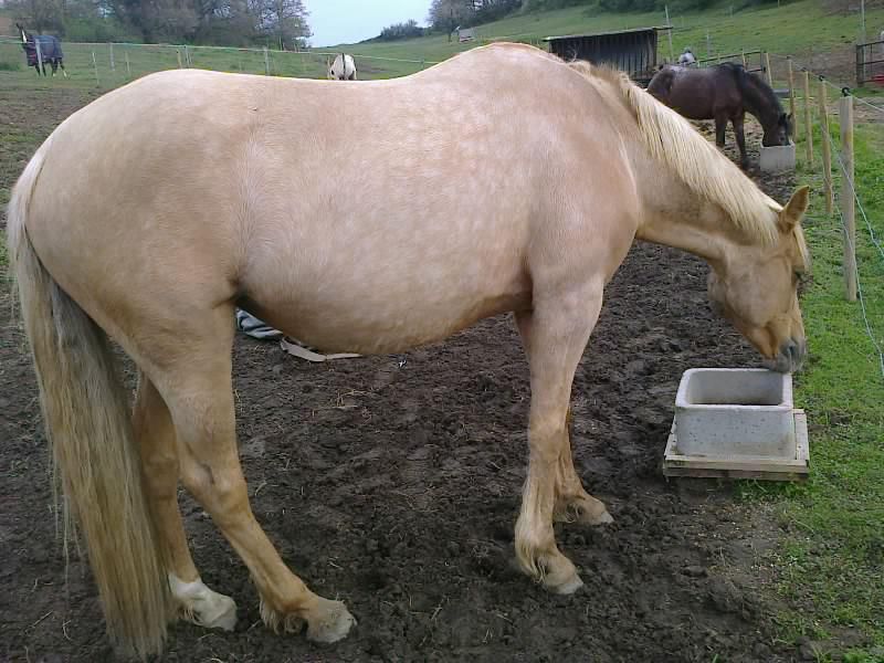 | Dire merci | non elle n'est pas pleine de Largo je l'ai achetée déja pleine la semaine dernière ^^ d'un étalon pie lui aussi, vraiment joli modèle j'ai acheté le papa aussi, que je vais d'ailleurs redonner a l'ancien proprio... le cheval est pif.... comme il était a moitié couillon sauvage, en liberté dans le champ je n'avais pas remarqué chez le monsieur c'est le lendemain de son arrivée chez moi "ah tiens il en manque un bout" et puis bon sur un cheval de 10ans je ne me fais pas d'illusion... et sinon, Salsa/Belzé donnerait il me semble soit du pie isabelle pie palo pie crème ou bien isabelle palo crème ^^ je ne sais pas si elle est homozygote ou non, elle n'a fait que des poulains pie pour le moment (le père des poulains n'est pas homozygote c'est sur car il a donné des poulains unis) |