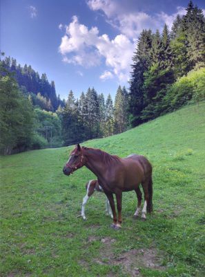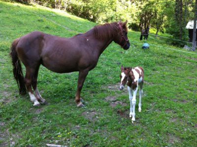 | Dire merci | Merci à toutes, je suis super contente, elle s'en occupe super bien, le poulinage s'est bien passé. La véto est passée tout est ok, kach a juste quelques hématomes et ils se percent petit à petit. Il est proche de nous curieux, je suis vraiment contente. Sinon la véto pense qu'il est pie bai voir peut être isabelle, l'avenir nous le dira. Shao tu passes quand voir ton neveu ? |