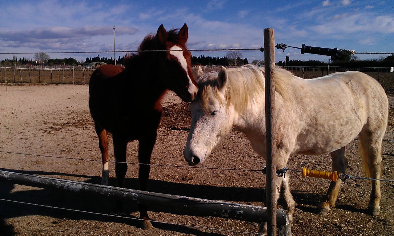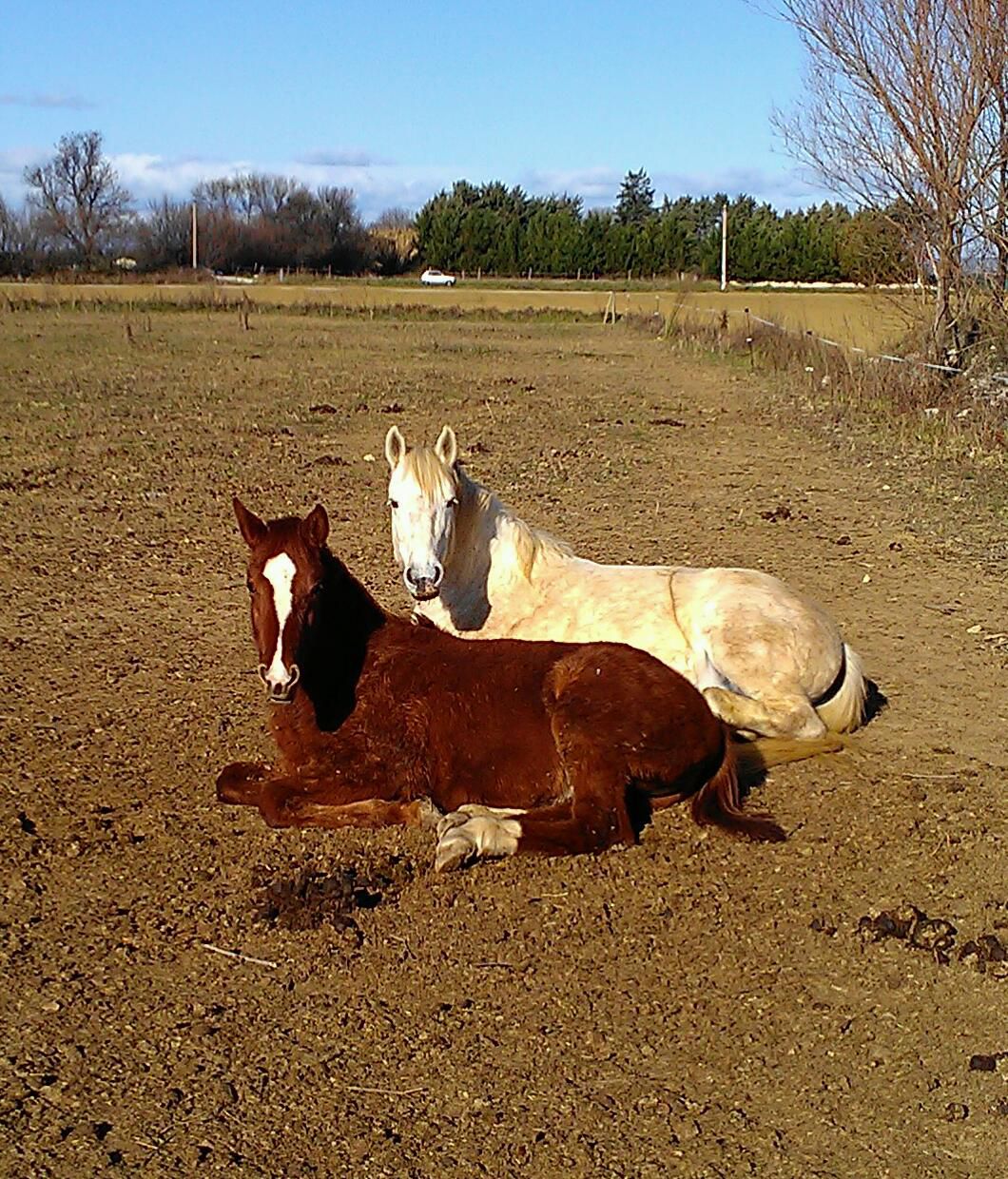 | Dire merci | Bon ca fait longtemps que je suis pas venue. C est la course. Trop belles toutes ces photos ça fait plaisir à voir. Pour les nouvelles, ma jument va bien même si son pb n est pas résolu. Je peux la travailler tranquillement. On est parties en ballade au pas elle a été géniale. Trop contente de sortir. Mon poulain lui s est retrouvé sur la route avec mon camargue.... Monsieur poupou sors des clôtures électrique sans les casser.... Donc début de semaine il sera ds barbelés :$ :S Bon une photo des 2 monstres... |
