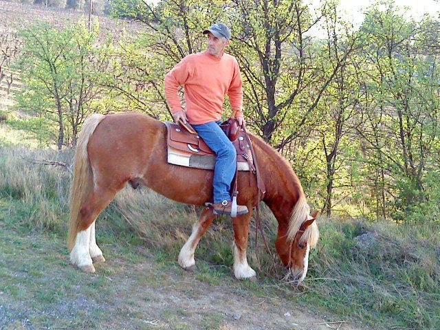 | Dire merci | parce qu'en fait, le haflinger de ma mère (Océan, rappel) n'avait pas arrêté de filer des coups de C** la dernière fois à Laura donc on a demandé à super "Ray-Charles Ingalls" de le "recadrer" !!! Le cow-boy a chaussé ses éperons de 15 cms de long, a vissé sa casquette sur sa tête, n'a pas craché dans le pot avant de partir mais presque et hop, en selle : Océan n'allait pas être à la noce... ![]() |
