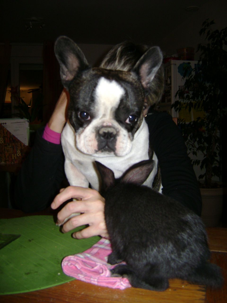 | Dire merci | C'est un lapin que Julie a sauvé d'une mort certaine mais qu'on n'a pas gardé (non pas qu'il n'était pas assez taché ) mais bon, y'a assez de bestioles comme ça à la maison donc elle l'a donné à quelqu'un du village...Allez, le Ray-Charles s'impatiente, monsieur a grand faim donc je vais devoir vous laisser là de nos aventures... sauf à mettre une photo de ce matin qui explique pourquoi le zhôm est affamé ce soir... |