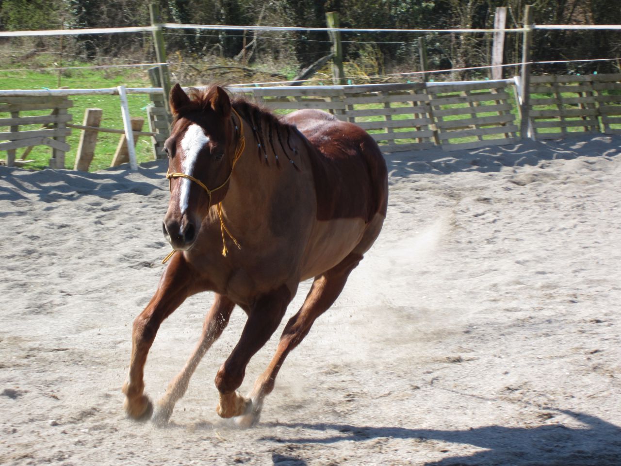 Déconnecté | La mienne aussi a bien la pêche quand je la monte alors on m'a conseillé de lui laisser cracher son jus et de la faire galoper si elle en a envie. Elle se calme rapidement et après on peut bosser! |