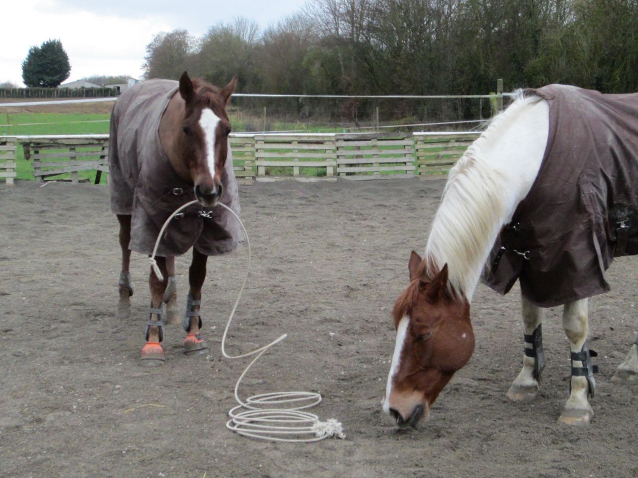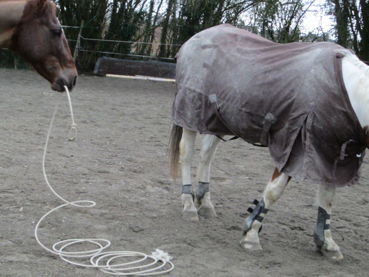 | Dire merci | amelie et edelweis merci du conseil je vais l'appliquer la prochaine fois si il recommence je crois aussi qu'il faut que je prenne d'autres paramètres en compte... aujourd'hui séance en liberté au lasso et comment dire ... CHAUD CHAUD CHAUD... en plus ma véto ma remit le doute sur son comportement avec sa question "a t il bien été castré ?" bah théoriquement oui ... mais la les juments qui recommencent a être en chaleur et notamment son amoureuse, ça le rend plus que joyeux... bon c'est quand même pas une raison pour me trimballer comme dimanche ... et puis aujourd'hui il s'est fauché et il est tombé a force de faire ses singeries le nez en l'air la queue en panache tel un étalon PSAR excité... à part sa demi heure de folie il a été plutôt agréable au lasso demi tour face à la barrière, demi tour face a moi en déplaçant bien les épaules, arrêts, bon contrôle des allures montantes et descendantes, rappel, reculé, déplacement des hanches et même quelque déplacements d'épaules (sur ce dernier point je galère à bien me positionner et lui me rate pas si je suis pas au millimètre près bien positionné il ne fera pas) |