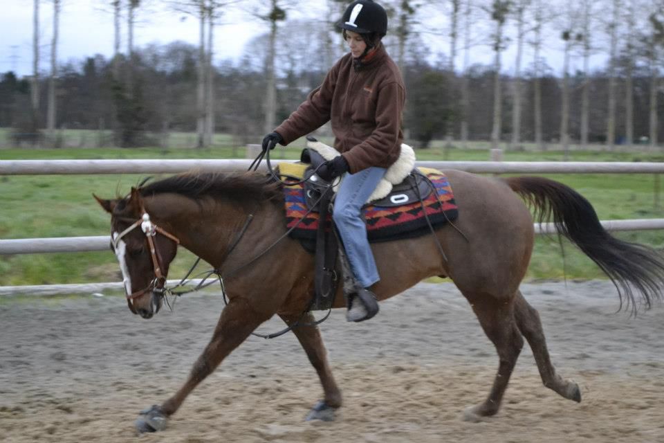 | Dire merci | Bonjour à toutes et a tous, je voulais pas trop faire de poste sur lui et puis beaucoup d'entre vous avez répondu a mes questions, m'avez aidé quand je trouvais pas de solution alors je me lance dans la présentation de mon Puck, QH né en 2003. La rencontre pâques 2006 je commençais a faire les petites annonces a voir avec mes moniteurs classiques pour me trouver un petit cheval de loisirs pas forcément pp, pour bidouiller en TREC, j’essaie quelque chevaux mais sans plus... (trop cher, trop louche, et pas de coup de coeur) un soir mon pere rentre du boulot avec une photo et me dit "tiens j'ai pris rendez vous pour aller voir Puck un QH pp" je regarde la photo, petit cheval alezan (j'aime pas) tout maigrichon (en meme temps il n'avait que 2 ans sur la photo je sais) et je dis a papa "tu t'es renseigné du prix ? un QH pp c'est pas notre budget tu sais", il me répond que non et qu'on verra sur place. jour de la première visite, on arrive chez les proprios, direct après avoir un peu discuté je demande le prix (pas envie d'avoir un coup de coeur pour de l'inaccessible) et la bonne surprise ![]() bon on va voir le loustic en pature un peu plus loin dans le village. il était encore avec sa mère et une jument dominante. les deux juments ont fait barrage j'étais la seule a pouvoir rentrer dans la pature et la je voir un petit gringalet avec une bouille a croquer il s'avance vers moi, me renifle et enfile sa tête dans le licol que je tenais... je fais le tour, il me donne ses pieds, se laisse bien manipuler, marche bien au licol, me suis déjà comme un petit toutou... il y a quelque chose qui se passe entre nous... je demande pour l'essayer... la proprio me dit oui mais qu'elle n'a pas de selle mais moi j'avais la mienne dans le coffre de la voiture donc je mets ma selle classique, un filet classique avec un mort tout gentil... je le brosse le selle un amour !je mets mes fesses dessus le cœur qui bat a 100 km/h et la je le marche dans la pâture en face de celle de sa mère et sa copine qui faisaient les folles et l'appelaient... lui imperturbable, a l'écoute très doux, je trotte tjs pareil, je fais quelques foulées de galop une pure sensation... je m’arrête, le félicite et met pieds a terre... |