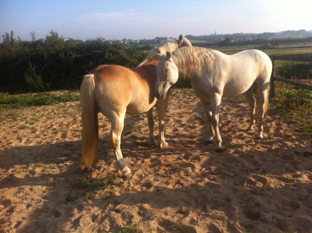 | Dire merci | Septembre arriva vite ... et l'idée de renouveler ma cavalerie se concrétisa par l'arriver d'un lusitanien un peu caractèriel ... en fait un cheval incompris qui demandait à être calmé ... Essais bizarre où je ne parviens guère à obtenir l'allure du pas et suis dans l'icapacité de maîtriser le galop ... mais j'achète !! Voici Sadio qui fait la connaissance d'un des hafli ! ![]() |