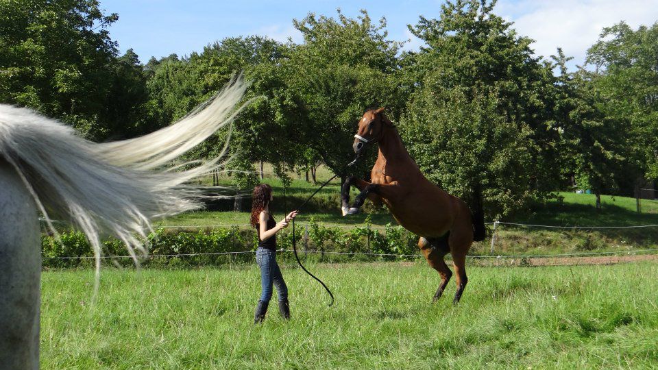 | Dire merci | Exact Clair que son passé reste bien présent, chaque jours il me fait comprendre que y'a une petite partie de ce qui lui ai arrivé qui influence sa façon d'être aujourd'hui. C'est le jeu quand on récupère un cheval comme lui, mais ça rends vraiment le travail très intéressant, précis et affiné. |