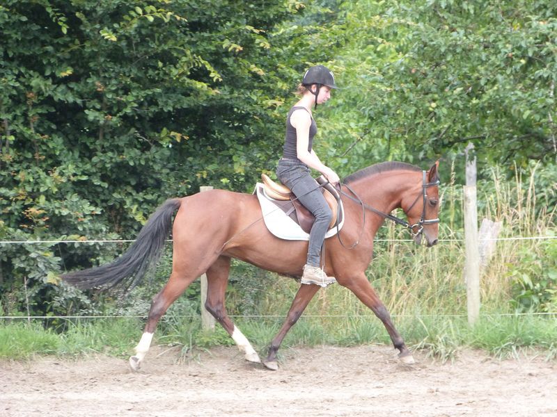 | Dire merci | Pour les nouvelles récentes: Denver était normalement en pension pour pouvoir le mettre au boulot en carrière. Mais le gros dinosaure a fait une groooosse poussée de croissance début juin.... ![]() Du coup, il est revenue à la maison en vacances au pré, et pour prendre sa place à la pension, on y a mis Tina. Tina n'avait jamais rien fait jusqu'à maintenant. Si ce n'est avoir quelqu'un sur le dos pour changer de parc... Donc c'était l'occasion de la mettre au boulot sérieusement. Depuis mi-juin, on a donc commencer à travailler. Les 1ères séances étaient un peu sportives... Madame a un caractère bien trempé, et elle a la cabrade facile... Mais très vite elle a compris ce qu'on voulait d'elle, et depuis elle progresse à une vitesse incroyable. Quelques photos d'une séance seulement 3 semaines après son arrivée à la pension ![]() ![]() ![]() ![]() ![]() ![]() |