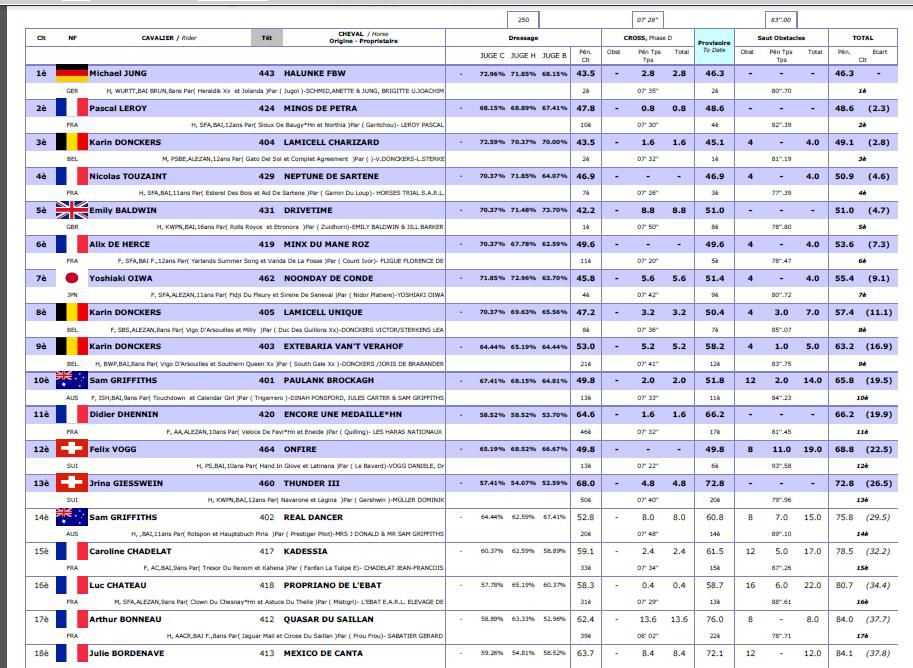 | Dire merci | Je viens de trouver les résultats du concours complet : Mickael Jung gagne le concours (sans grande surprise ) et on a un français en deuxième : Pascal Leroy avec Minos de Petra. ![]() |