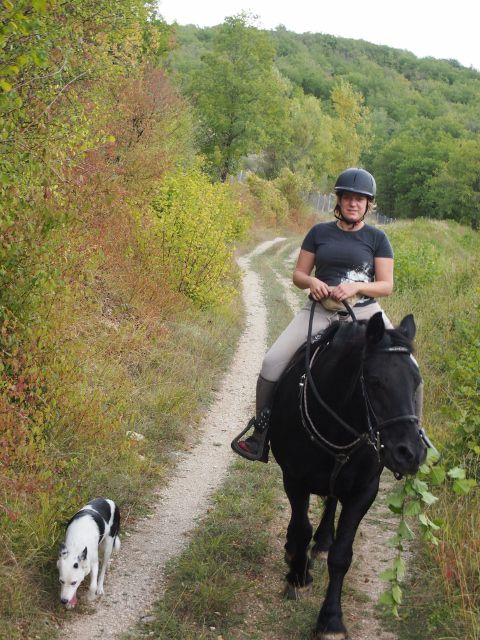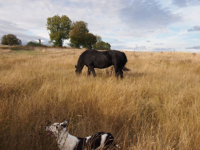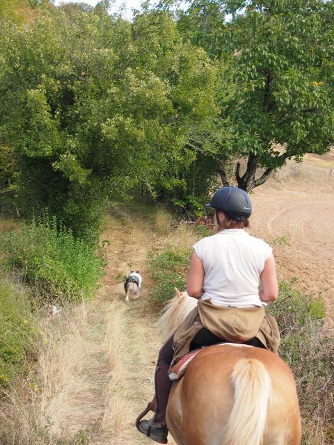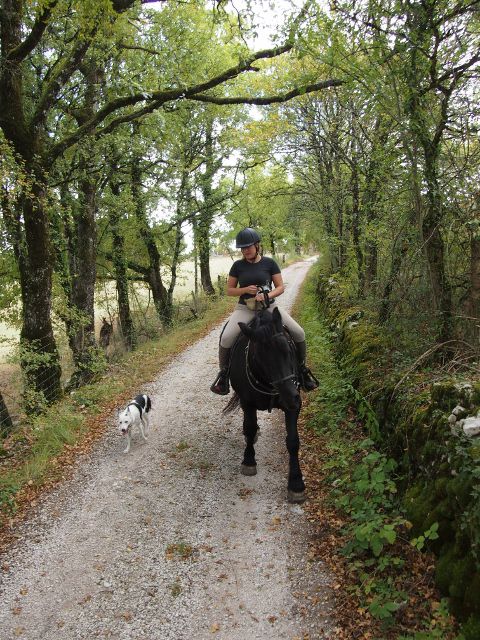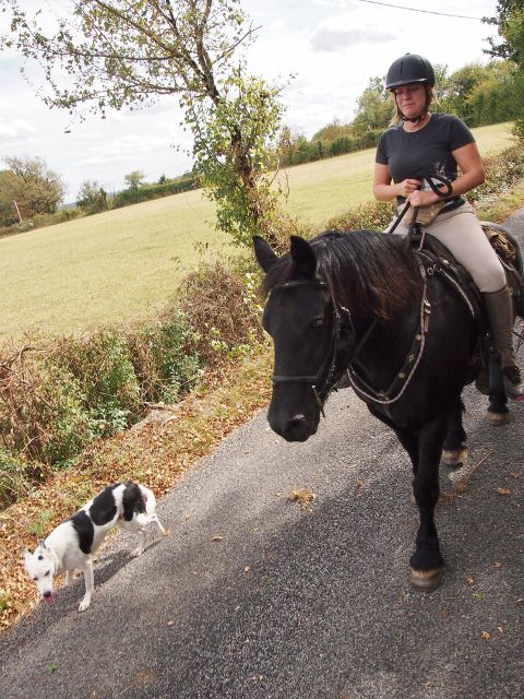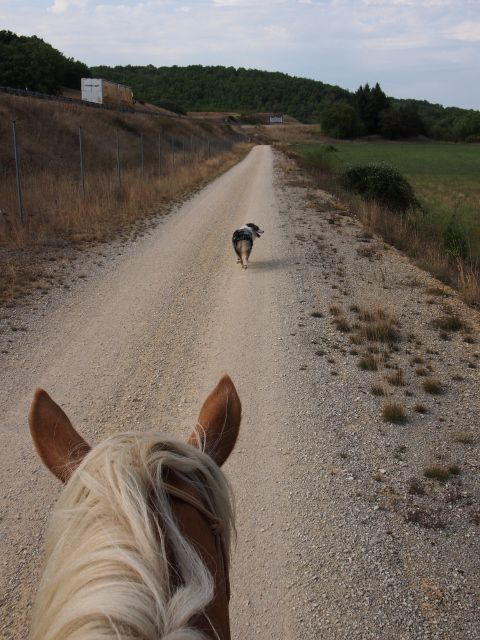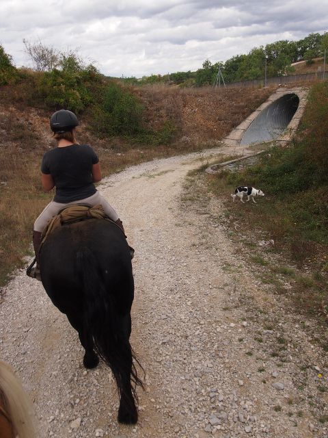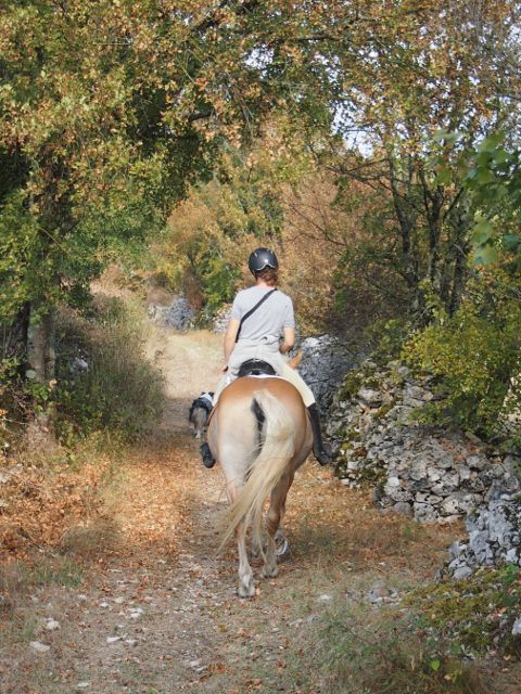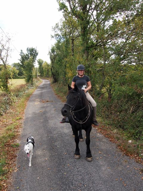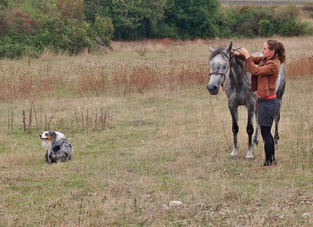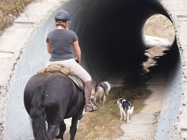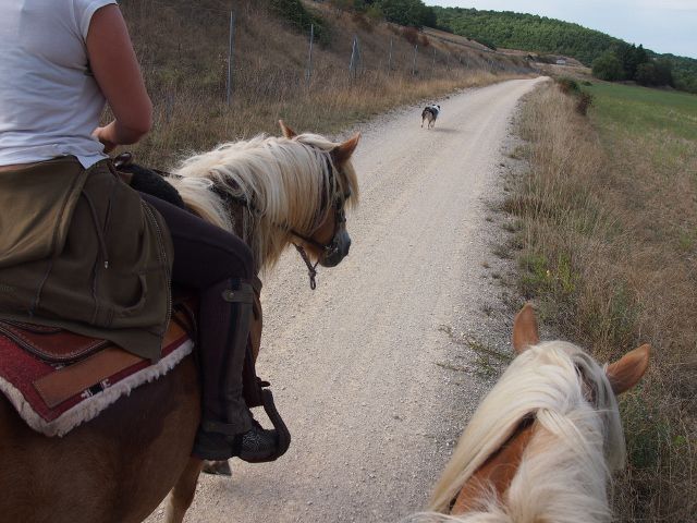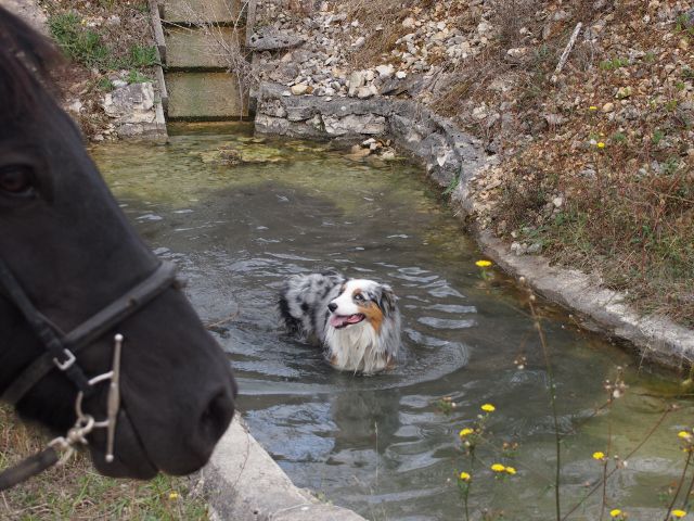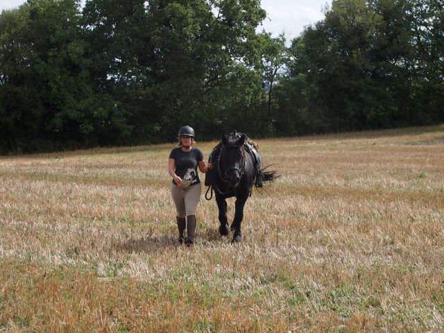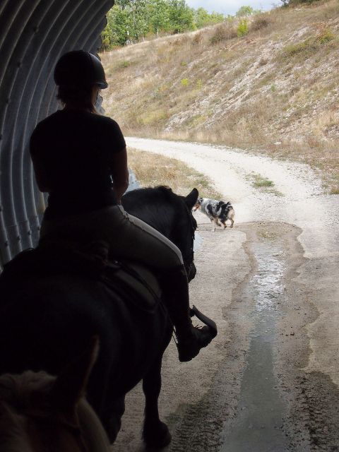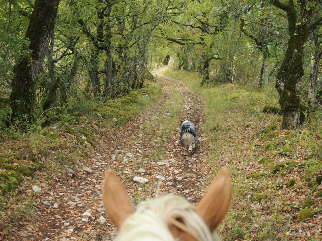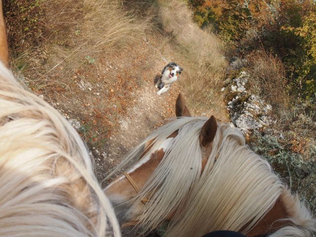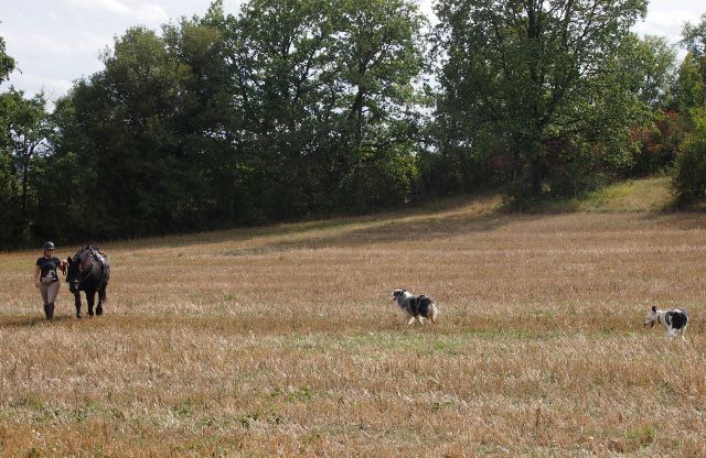 Déconnecté | De nouvelles photos à venir avec ma copine F qui a ses juments en pension chez nous, elle monte sa jument Handy ( trait x trait breton) et moi toujours sur Jocko. Et grande première, nous avons pris avec nous nos deux chiens : Ermès mon berger australien et la chienne de F, Georgia ( border x berger australien ) Les deux toutous nous ont suivis sagement (Ermès un peu moins )Mais tout ce petit monde a quand même été adorable |