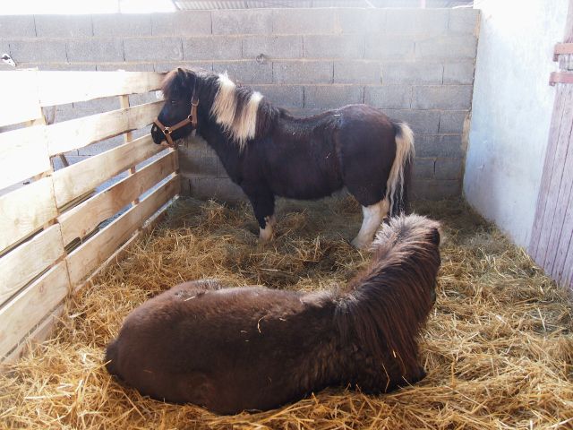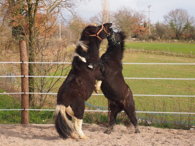 Déconnecté | Milouz, c'est remuant deux entiers ensemble ! Non mais ils sont assez sages en fait, ils jouent beaucoup , ils se mordent et se battent"pour de faux",ils ne se tapent jamais par contre: c'est très drôle de les regarder, ils jouent comme de jeunes chiens! Chapaval, je ne savais pas que tu avais un poney (non, le plus beau, c'est Calin )Alors, si tout se passe comme prévu Radja et Isi resteront ensemble et avoir un petit régulièrement comme chez leur ancienne proprio. Là normalement aucun soucis vu comme les poneys sont faciles à vivre Ensuite, Bandhu le petit jeune de 2 ans sera certainement castré et débourré pour être vendu mais ça peut évoluer avec le temps. Et Vallti le pie, qui est vraiment très peureux mais très gentil aussi devra nous faire plus confiance (c'est pas gagné et ça prendra du temps) pour pouvoir être débourré et pourquoi pas le mettre aussi à l'attelage (mais rien ne presse pour lui) et lui trouver une petite femme d'une jolie couleur tant qu'à faire. Et puis si il y a un peu de demande on proposera les étalons à la saillie, on commencera avec Radja |
