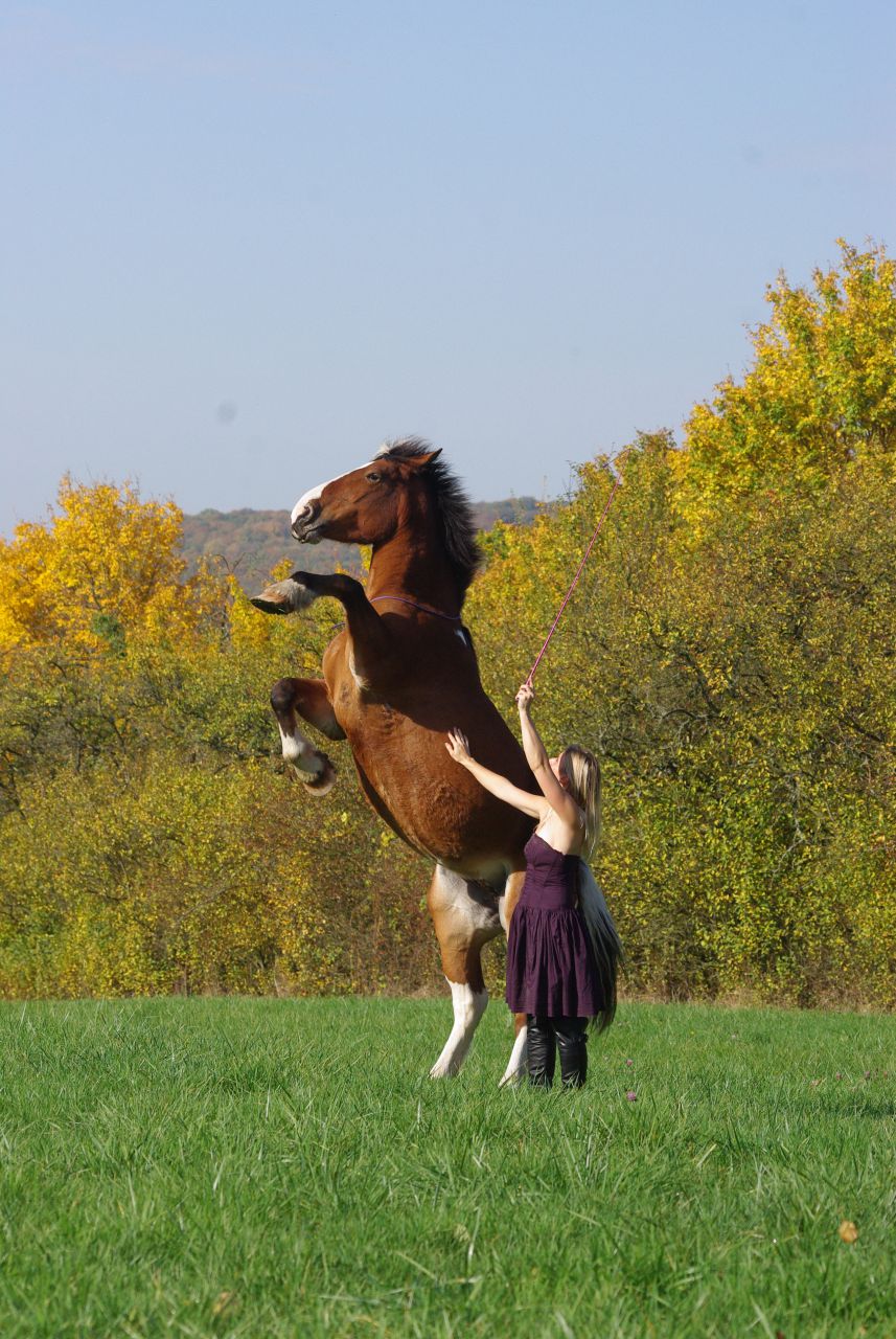 | Dire merci | merci à tous ça fait chaud au coeur! Il en reste encore, dès que j'ai la patience je les mets! Savane et moi on se sent bien dans nos pompes en ce moment, alors faut le dire aussi quand ça va! J'essaie de me mettre au dressage tout doucement avec les moyens du bord, sans moniteur pour le moment. J'essaie de retrouver mes sensations d'avant, quand j'étais en club, et j'essaie d'apprendre à savane à avoir un petit galop et à remonter son dos et se mettre en place. Ca vient tout doucement, mais je ne suis pas toujours très sure des moyens pour y arriver. Nos autres objectifs, former Savane à la voltige, et moi aussi par la même occasion. Je commence par la voltige classique mais le but final serait la voltige cosaque, c'est beau de rêver! Du côté de Savane, il faut qu'elle apprenne à avoir un petit galop cadencé, ce qui n'est pas une mince affaire, et aussi à tenir le galop. En balade ça va, mais en cercle, un cercle et c'est fini! ça tire, ça trotte! Et de mon côté ben faudrait m'enlever le plomb que j'ai dans les fesse car elles me tirent toujours vers le bas foutue loi de Newton ![]() je prends confiance petit à petit avec des exercices simples de voltige classique, mais on en reste là pour le moment. J'essaie de faire des assouplissements, l'idéal serait chaque jour, j'en suis à 2 fois par semaine d'assouplissements, c'est déjà ça. Donc voilà! Niveau travail en liberté on en fait quand ça nous chante, sinon farniente et balade, sont nos activités favorites du moment! Ce week end on les rentre au boxe, donc à la maison, mais dans une toute nouvelle stabule pour laquelle on s'est saignés cet été! je prendrai des photos à l'occasion |