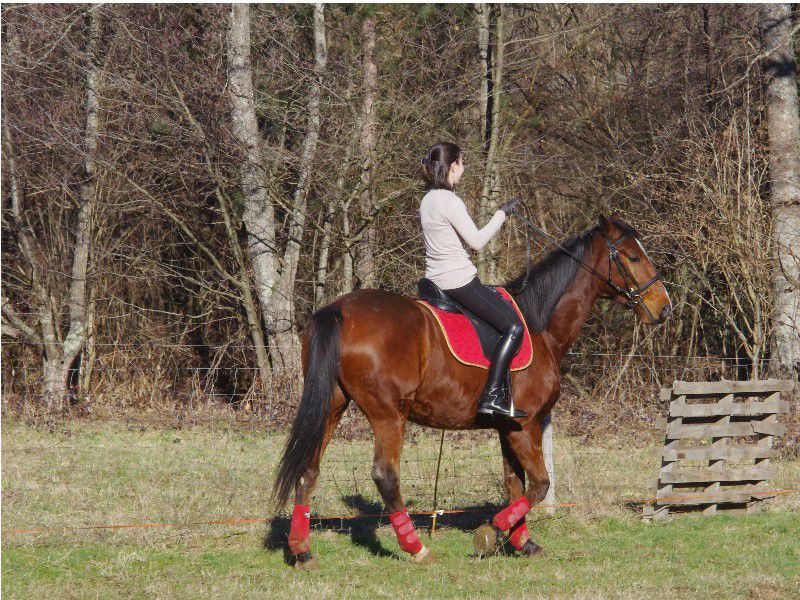 | Dire merci | Alors le stage : - je tire au sort au moniteur pour le cour, on discute de Loulou et du travail - je detends en montrant ce qu'il sait faire (bon j'ai detendu vite fait tout le monde me regarder ) - la monitrice essai Loulou et me donne le programme : travail en extension - on commence à pied avec des flexions puis extension à l'arret et on monte, la séance est basé sur travail en extension pour qu'il vienne tendre ces renes et pas etre à l'envers. Je suis les conseils, c'est dur dur, il a du mal à rester au contact plus bas, mais vers la fin elle me demande plus de rythme au trot et du coup du mieu! ![]() - debrif de la seance pour moi et Loulou et conseil de Karl : travailler toujours en flexion vers l'interieur, les flexions suivi d'extention, pas plus bas que l'horizontale pour pas perdre en equilibre Ils ont trouvés Loulou sympa ![]() - debrif pour la monitrice ou il lui est reprocher d'avoir mis trop de temps à demander du rythme Karl a dit que je me debrouillais pas mal Pour Marsu : les mains hautes nous ont bien permis la d'approfondir le travail en action reaction ou le cheval vient s'etendre lorsque l'on monte les mains Normalement on refait en avril! Et le lendemain j'ai pu regarder les moniteur prendre des cours avec Karl Par contre pas de photo dans le manege ça fesait vraiment pourri et video pas possible... |