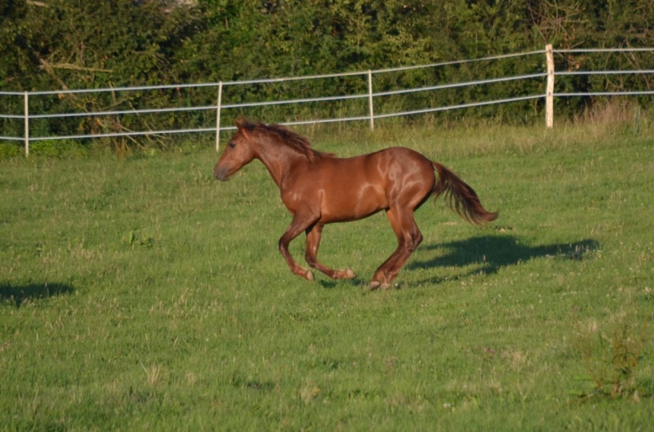 | Dire merci | Comme promis je viens poster quelques nouvelles de l'élevage!!! j'en aurais tellement à vous en mettre que je vais devoir sélectionner! je vais essayer d'en mettre plus régulièrement! Tous vont à merveille! Tout d’abord, ça y est je suis monté la toute première fois sur Beltis !!!!!!! sans passer par le montoir mais en m’appuyant sur les étriers, et nickel il a une confiance solide en moi donc super facile pour l’instant ! Il marche au pas et arrêt pour l'instant dans le calme c'est top! en même temps il écoute bien ma voix donc le débourrage est facilité ! On verra la semaine prochaine, on commence la mise en avant au trot.... on y va tout doux car rien ne presse! En selle! ![]() Sinon, je continue de me faire plaisir avec Véga qui a la super patate !!! Sur le plat, je me régale et en balade : elle avance sans se poser de questions!!!! on s'est fait un des ces galops la dernière fois, digne d'un rêve juste entre elle et moi!!! Ce qui est génial avec elle c'est qu'on a l'impression de l'avoir monté la veille!! Elle est détendue, se souvient de ce que l'on a travaillé! Une photo du retour d'une de ces belles promenades : ![]() des jolis portraits: ![]() Ma DIVINE!!! et ses belles allures ![]() ![]() Divino continue de grandir, il devient un poulain sérieux, mature.... Je l'ai enfin toisé et il mesure à 17 mois 1M46! donc c'est clair il va bientôt dépasser Beltis Je continue de le voyager régulièrement en van. Je l'ai emmené chez des amis qui ont une carrière et un copain montait une jument aux 3 allures et sautait même des obstacles. Divino a henni au départ car il y avait pas mal de chevaux là-bas. Il s'est bien comporté. Il m'écoutait plutôt bien! il a pris sur lui quand la jument sautait les obstacles et venait au galop juste sous son nez!!!!!! ![]() Contente de cette première sortie car Divino est un poulain qui a du sang, il est tout feu tout flamme! très réactif! qui réfléchi.... Il est l'inverse total de Beltis face à une difficulté! Beltis plante tout quand il est effrayé alors que Divino il y va mais parfois il faut le suivre! ![]() Quelques photos de mon petit prince, mon cheval-soleil! et aucune des photos ne sont retouchées, ce sont ces vrais reflets qui sont différents selon la lumière!!! Mais qu'il est beau!!!! oui je sais je ne suis pas trop objective! ![]() Cette tête si parfaite!!!!! ![]() Divino première douche un AMOUR!!! ![]() ![]() Sinon, je continue les balades en main et il est vraiment top que ce soit seul ou à plusieurs il est égal à lui même! Il avance, avance, avance!!! il ronfle encore un peu quand il voit ses copines les vaches mais ça va beaucoup mieux! En balade! ![]() Passage de flaques: ![]() Au trot! ça on adore! ![]() Puis quelques photos de délire total au pré!!!!!!!! ce que j'aime les voir comme ça, se déchaîner!!! La vie en troupeau ça c'est irremplaçable!!! ![]() ![]() Gwladys et Divino en pleine course!!!!!! ![]() ![]() Comme toujours le poons devant qui mène la danse!! mais Véga n'apprécie guère car elle aime être devant comme une vrai leader! ![]() Et Divino double Gwladys: ![]() Divino qui tente de doubler Véga, Véga sur 1 patte!!! ![]() Véga pousse un max pour prendre la première place!! ![]() Divino qui n'a pas dit son dernier mot!!! Lui c'est plutôt le méga cool au pré mais là l'honneur est en jeu! ![]() Poulinou donne tout!!! Divino a une sacré amplitude, que ce soit au pas, au trot ou au galop: ![]() Gwladys avec son accélération si facile!!! Elle doit repenser à ses exploits sur les parcours d'obstacles quand elle était plus jeune..... ![]() Divino qui a une tête si parfaite à mes yeux, une expression rare, c'est vraiment ce que je recherche chez un cheval ...... ses crins ressemblent aux rayons du soleil! Mon cheval soleil: ![]() Il n'est pas un frimeur, mais alors pas du tout, un mec très discret mais quand il sort ses belles allures, on en prend plein les yeux!!!! il a vraiment de qui tenir entre son père et sa mère: LA légèreté de l'ibérique ![]() Complètement fan de lui!!!! ![]() ![]() Beltis qui a ENFIN un très joli palomino! ![]() ![]() Et maintenant Dandrane qui se trouve dans le pré à côté des autres! Le poney a voyagé dans chacun des troupeaux mais finalement il reste avec celui de Dandrane! La troupe des rouges!!! ![]() Elle devient superbe!!! elle quitte son corps de poulinou peu à peu!!! elle a un super mental comme Divino, bref j'ai la chance des chevaux en or!!! place aux photos!!!! ![]() ![]() ![]() ![]() ![]() ![]() ![]() En mode guerrière! ![]() ![]() [img][https://www.1cheval.com/membre/services/photos/images/185726.jpg/img] ![]() Je n'ai pas de photo de balade en main avec elle, j'en ferai une prochaine fois! Voilà je vous ai écrit un roman!!!! afin de combler mon retard! |