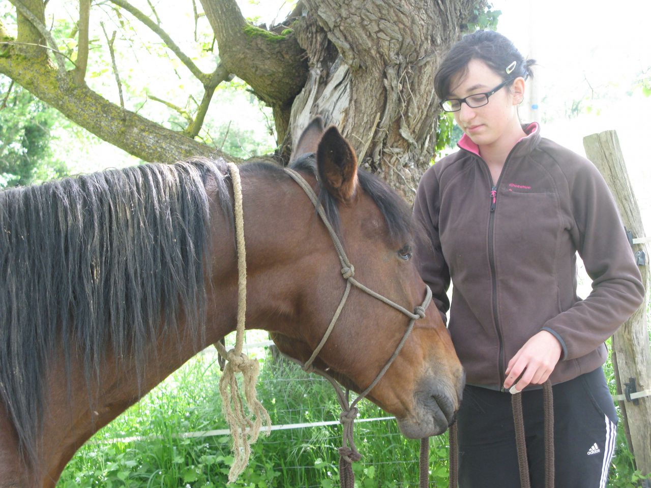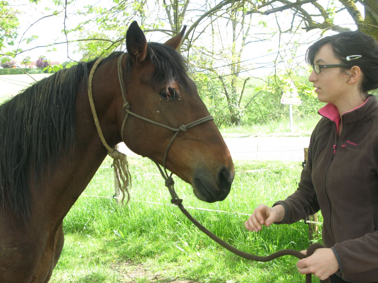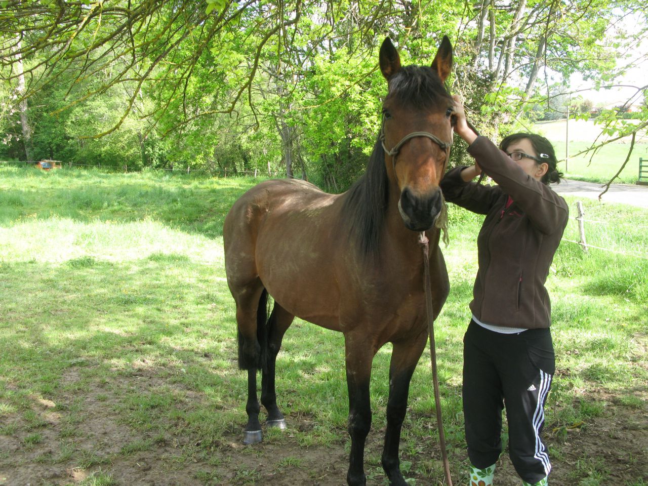 | Dire merci | alors ce matin, on arrive au pré et le cheval vient au trot en hennissant il ne bouge pas dutout quand on l'approche et quand on le caresse, tiph32 lui met le licol dans le calme ![]() ![]() ![]() ![]() ![]() |