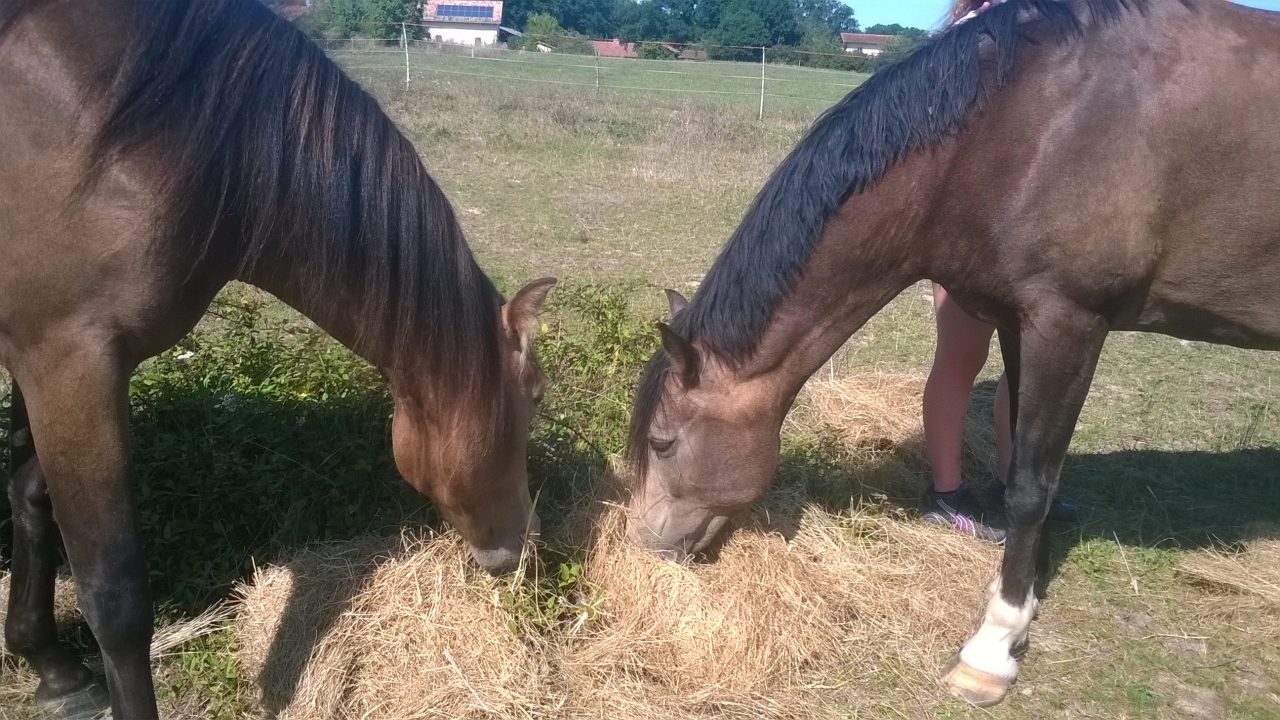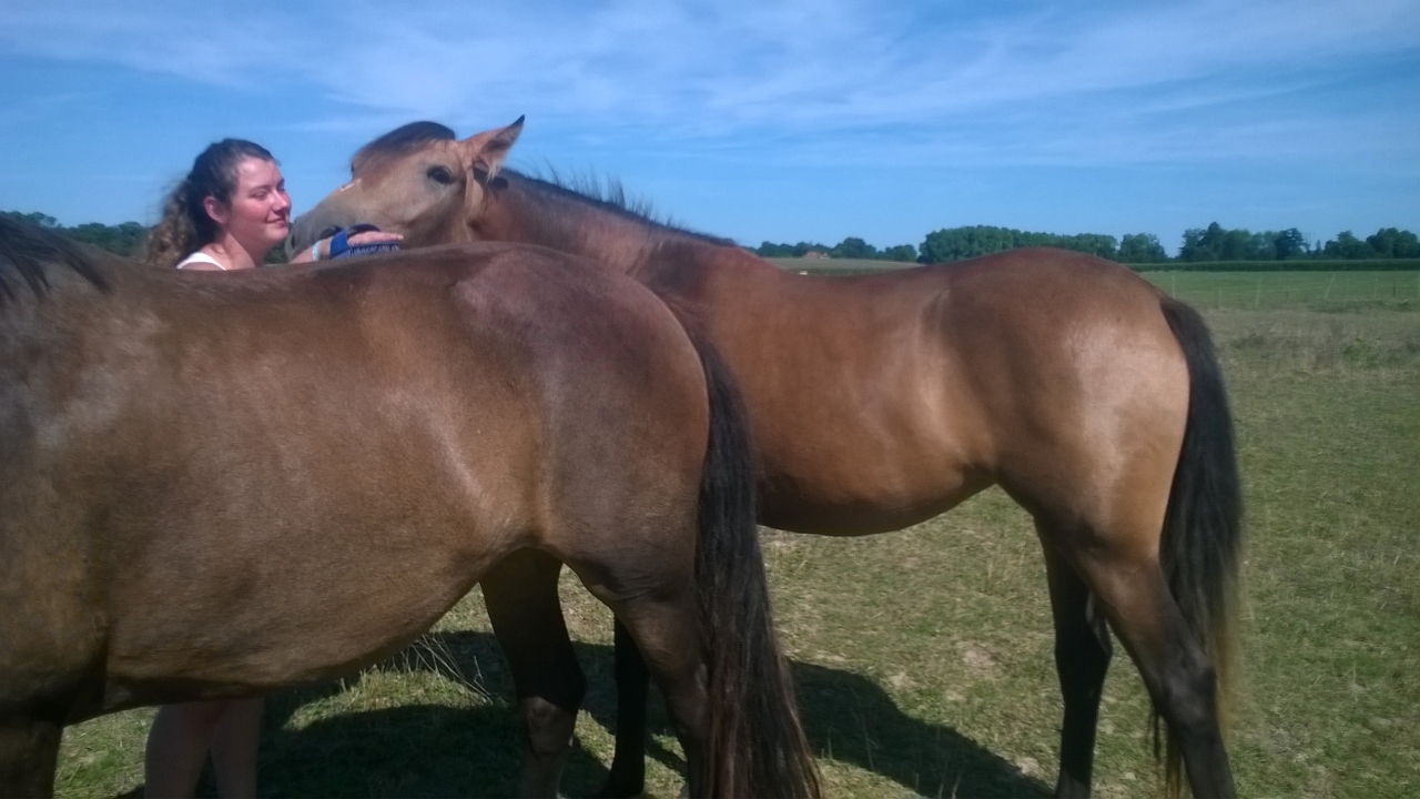| Dire merci | Chipie, D'Une d'Or et Monoï sont ensembles. J'ai laissé Quina et Bounty dans leur pré, ça m'a l'air de convenir à tout le monde. Ce qui m'arrange également, c'est que je vais commencer à ressortir Monoï et au moins, D'Une d'Or ne restera pas seule pendant mes balades. |