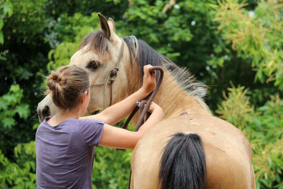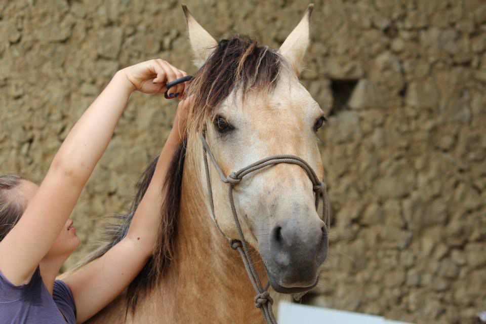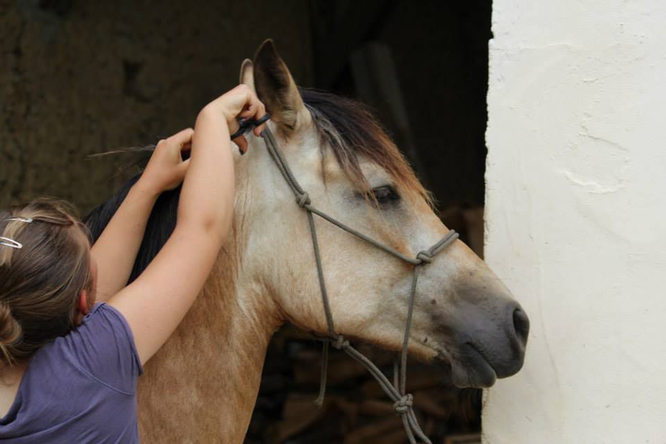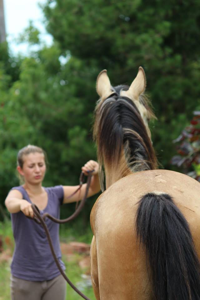 | Dire merci | mardi, séance à pied avec suerte en debut d'aprem, la veille a du servir car il tient beaucoup mieux l'arret et est plus attentif à moi .. on bosse 30 min environ: bon pansage, ( couper la queue, le passage de tetiere ect) puis travail sur les cessions à la pression (flexions, hanches, épaules, reculer), on essaie de maintenir la position tete en bas qq secondes, on bosse sur reculer à distance et rappel globalement c'est positif |