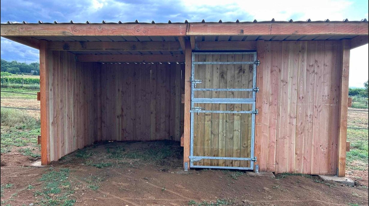 | Dire merci | Non celui là il était vendu avec le montage. Nous on a fait les plots en béton et il a été monté hier. Je suis vraiment contente, Léo l'a adopté de suite, et heureusement au vu des orage qu'on a depuis hier. Maintenant j'ai des plaques à installer sur le sol de la sellerie, et à installer tout ça. Il faut que je mette des anneaux d'attache je ne sais pas encore où, que j'installer la douche et monte l'abri dans le dernier parc. Et que je ramasse encore des cailloux Mais alors là c'est vraiment trop chouette. |