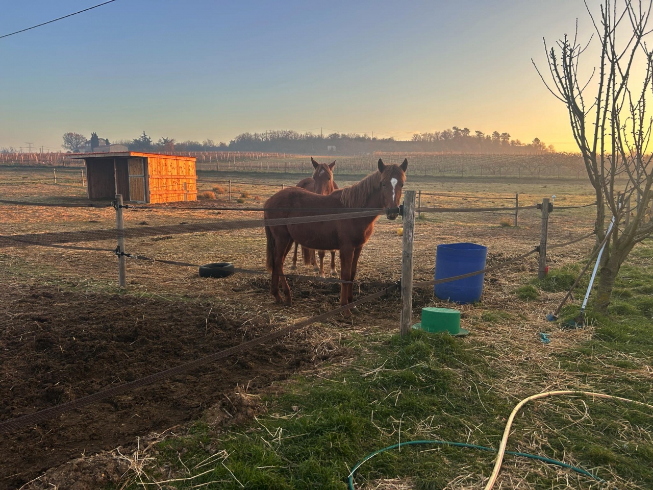 | Dire merci1 | Oui ça se passe bien, et au pire un dans l'abri et un dans le box. Léo fait un peu le chef au moment de la bouffe, mais de moins en moins. A terme j'avais prévu de faire des boxes contre le manège, mais je ne sais pas si ça va m'être utile. Avec les abris dans tous les parcs et le box de secours je n'en vois pas l'utilité pour le moment. Là sous le manège je vais faire ma sellerie et un air de pansage avec le stockage du foin. Ca va pas mal comme ça au final. |