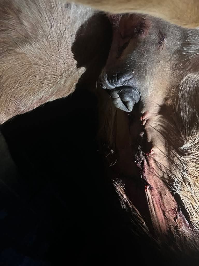 | Dire merci | Je vous mets de photos mais on ne vois pas grand chose il faisait nuit et on voulait pas l'embêter, et il n'y a qu'une partie des plaies.![]() ![]() |