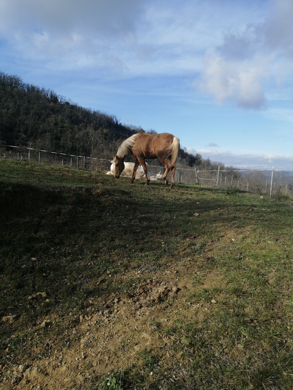 | Dire merci | Toujours l'hiver. L'été il est tout caramel uni. Bon là el a les pied tout sale, leur paddock est cracra boueux mais je ne veux pas les enfermer complètement ils font ce qu'ils veulent. L'année prochaine on va essayer de stabiliser tout ça. |