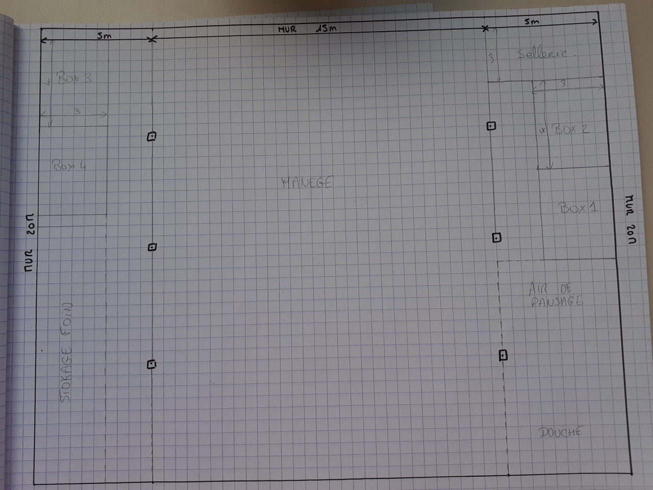 | Dire merci | moi j'aurais mis les 4 boxes du meme coté pour isoler la partie stockage foin des boxes. Et j'aurais mis la sellerie a coté du foin et devant la douche (l'eau le plus loin possible du foin). Tu ne peux pas faire d'ouvertures dans le mur coté extérieur? Ca fait faire de gros travaux j'imagine? Parce que j'aurais imaginé des boxes-terrasse si tu pouvais faire des ouvertures sur l'extérieur. |