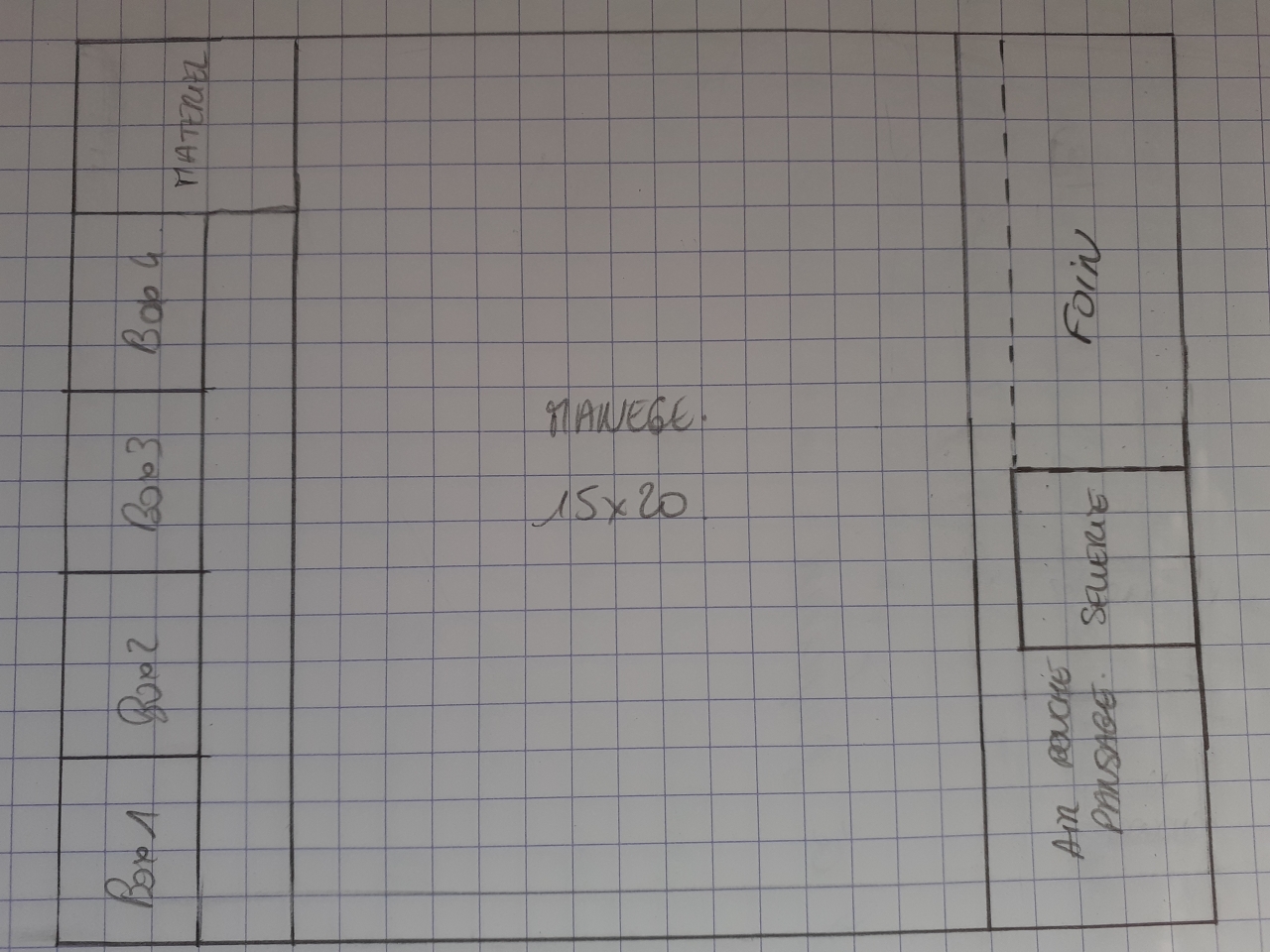 | Dire merci | Bon voilà mon dernier plan, à l'échelle, un carreau = 1m² Ça me paraît pas mal au final et peut être plus cohérent. Les couloir font 2m de large, je réfléchis aux barrières du manèges démontables facilement. Les box font 4x3m pour de l'occasionnel ke trouve ça pas mal. Après j'affinerai certainement sur place. Il y a l'eau et l'électricité dans le hangar, ainsi que des évacuations ça facilite le truc quand même. Il va falloir également que j'étudie le budget au mieux également. ![]() Message édité le 13/01/22 à 11:54 |