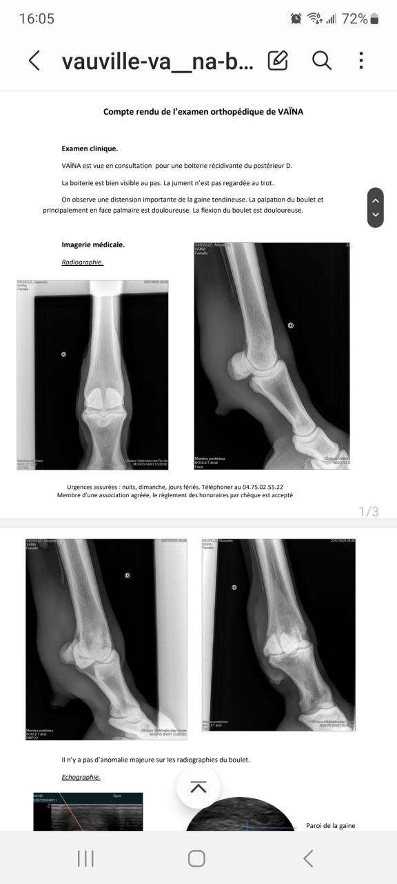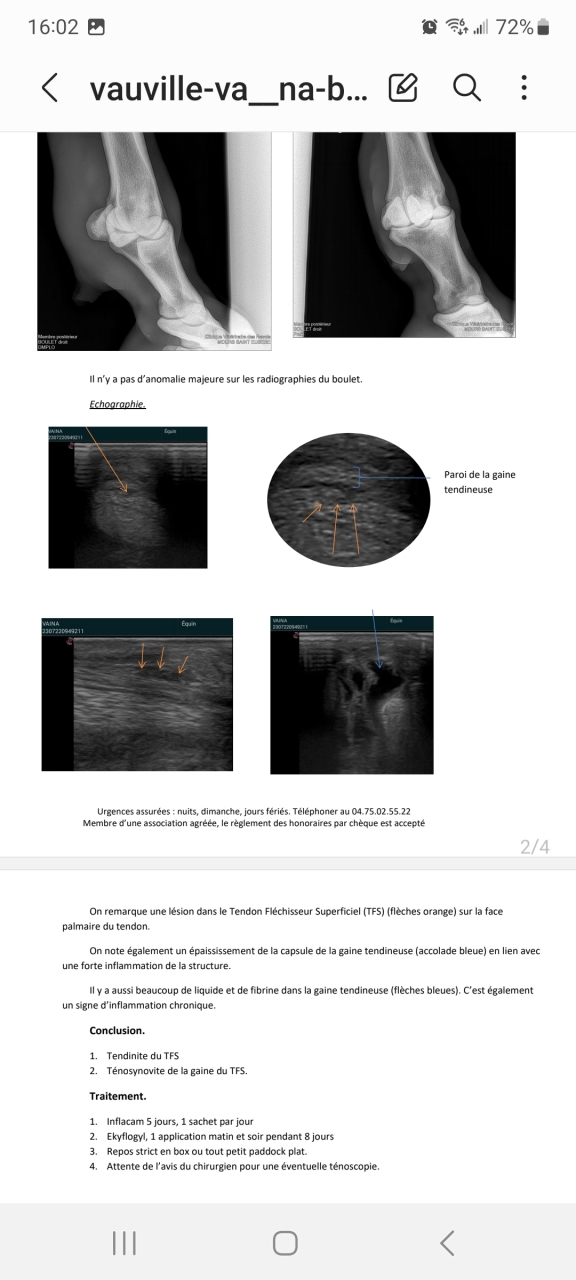 | Dire merci | Lésion du tendon superficiel, grosse inflammation de la gaine et gros épanchement. Donc on attend l'avis du chirurgien si il faut opérer. Inflammation de la parois de l'os mais légère là où elle s'est mise coup. La premier veto à pas fait les radios et l'écho au bon endroit. Donc on a pas pu comparer l'évolution. Voilà voilà on est parti pour quelques mois de soin. |