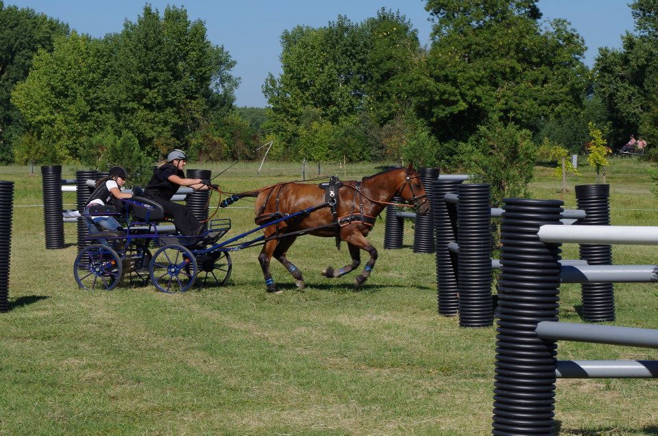 | Dire merci | Et donc pour la dernière épreuve, la maniabilité, je redoute car on n'a pas du tout bossé sur ça non plus... et avec le manque de dressage et le peu de marge entre la largeur de la voiture et la largeur des portes ![]() Tant pis, il faut y aller, et du mieux possible! une bonne place en dressage et marathon honorable, je me dis qu'on doit pouvoir figurer en milieu de classement. ![]() Je tente des réglages de dernière minute sur le terrain de détente ou il y a 2 portes, débuts cata, cheval sur les épaules, qui s'appuie et se déporte au moment du passage dans les portes je mets plus de rythme et joue des doigts pour alléger le contact, quand il se déporte, je change immédiatement de direction pour aller à l'opposé, puis j'aide de la voix, ça commence a le faire ![]() Je rentre sur le terrain, je salue, on se lance dans un bon trot, avec de l'impulsion, et il est léger dans la main, attentif et précis, on passe toutes les portes sans aucun problème, dans un tracé très fluide avec une très bonne allure, juste un plot renversé par ma faute car je ne l'ai pas envoyé bien en face ![]() Nous sommes tout de même félicités pour ce très beau parcours et ils sonnent même la musique du sans fautes en récompense |