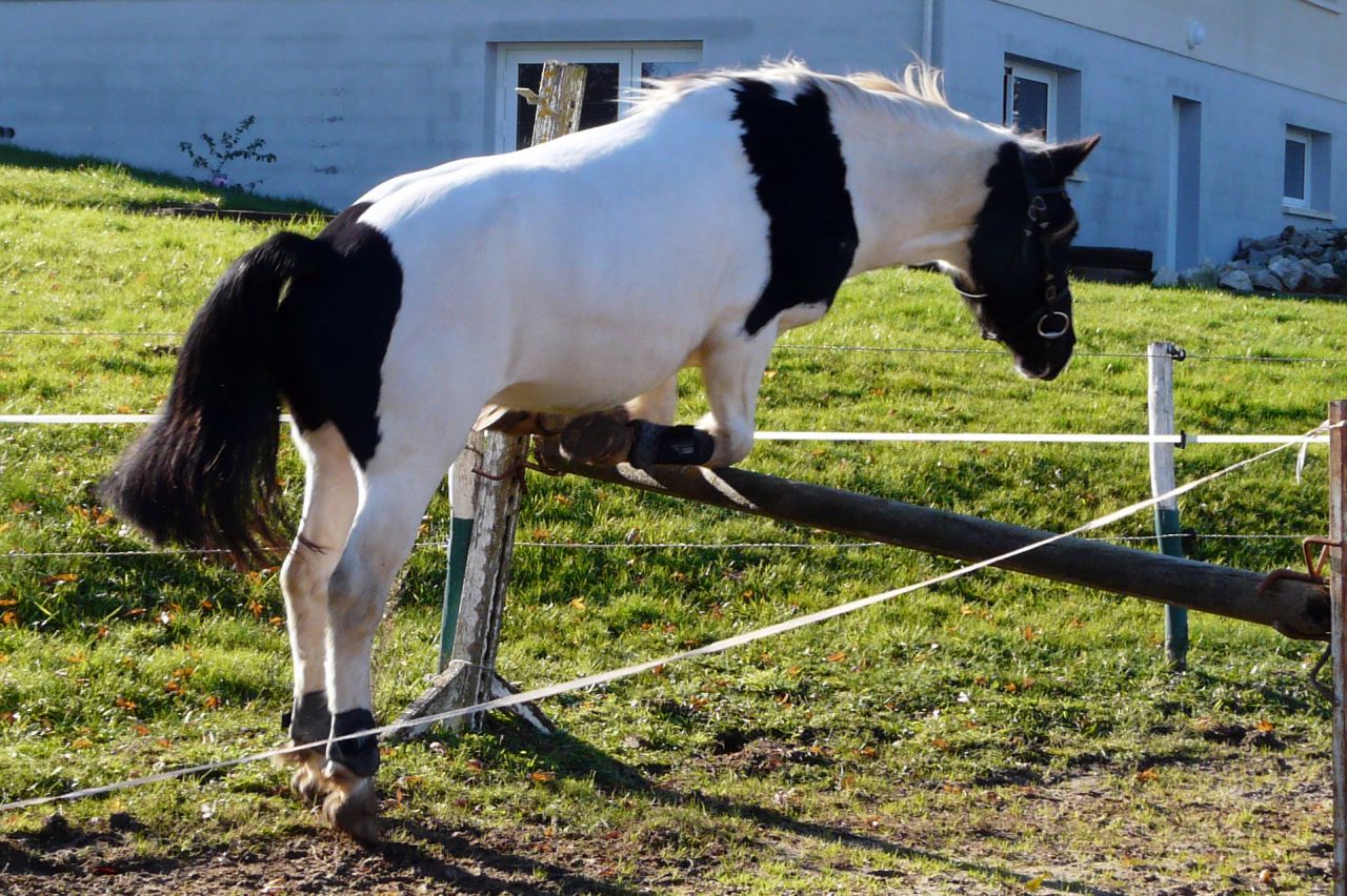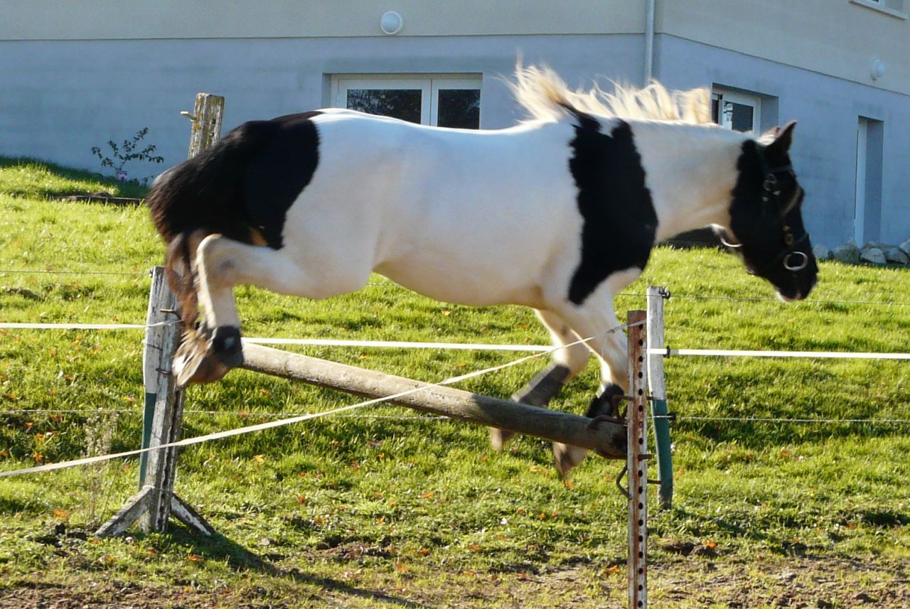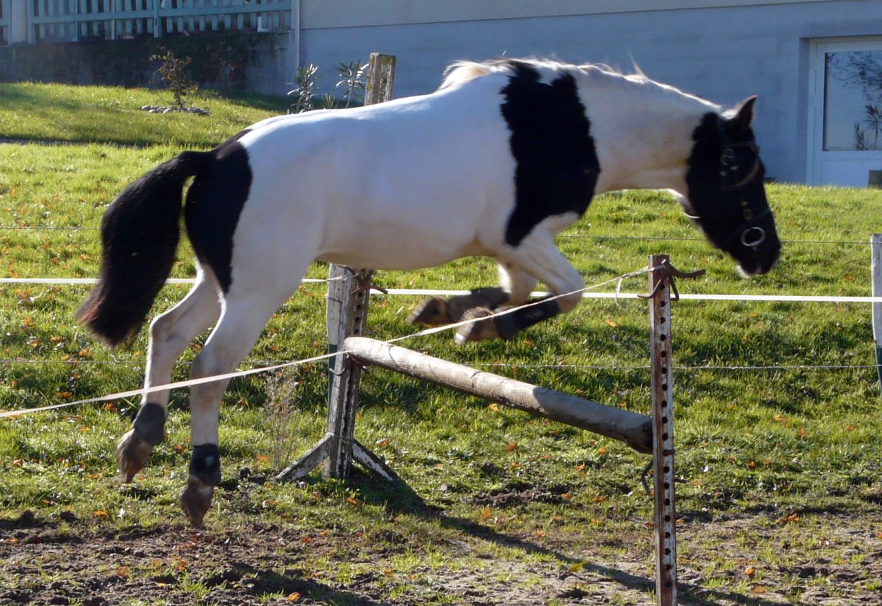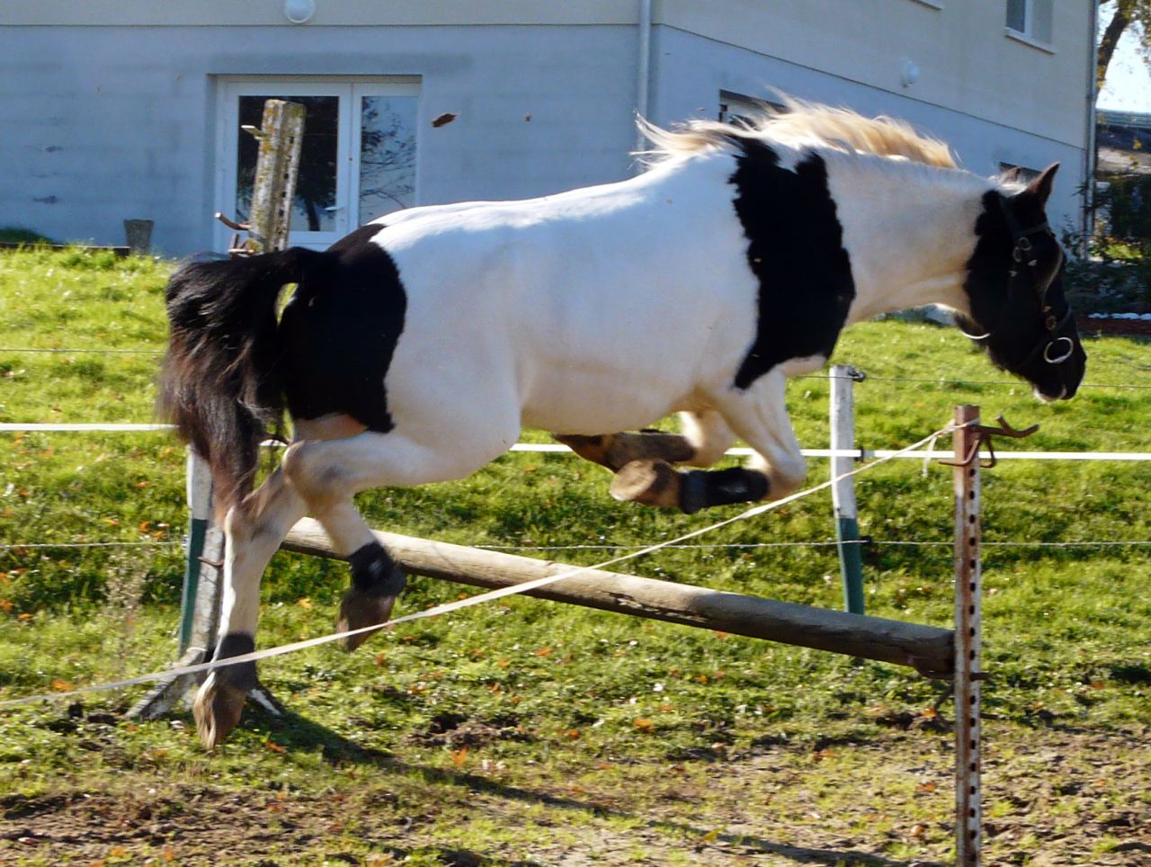 | Dire merci | Bon la technique n'est toujours pas bonne mais il a pris une meilleure place bien que ça soit encore un peu près et il a fait l'effort de passer bien au dessus La séance ne s'arrête pas la ![]() je mets la longe sur le mors et je tente les exercices cession latérale d'encolure + cession des hanches, tout nickel de suite! Une petite résistance à main droite mais rien de méchant. Je continue avec un montoir des 2 cotés, immobile et pas stressé, nickel, je redescend, puis j'essaie de la mettre en longe sur le cercle au pas. Il comprend assez vite, ce qui me permet de lui apprendre les ordres marche arret. Je continue un peu en me décalant derrière lui pour simuler la marche aux longues renes, il s'en fiche donc super, puis j'ajuste la rene, il donne la tête et amorce le tournant je refait plusieurs fois aux 2 mains super.Pour finir, je remonte sur son dos, cessions latérales d'encolure des 2 côtés, puis je mets mon talon sur son flanc pour espérer pousser les hanches, et ... CA MARCHE !!! il bouge de quelques pas a chaque main puis finir par faire plusieurs pas d'affilée et s'arrête, sans stress ![]() Je laisse sur ça |